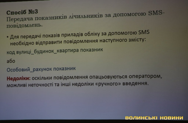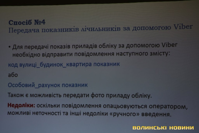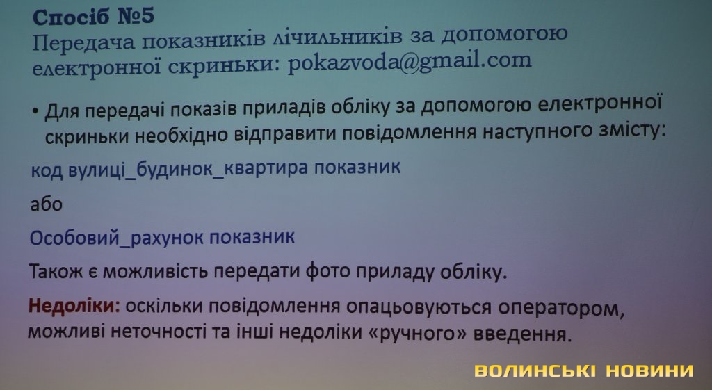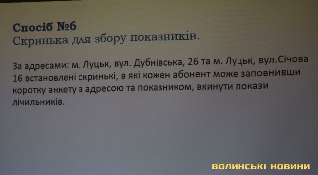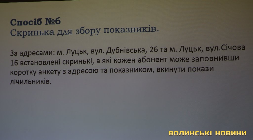 Третім способом є передача показників за допомогою смс-повідомлення у певному форматі, четвертим – передача показників через мережу Viber, де можна просто надіслати фото лічильника, вказавши адресу, п’ятий спосіб – надсилання показників на електронну пошту «Луцькводоканалу», шостий спосіб – заповнення короткої анкети, яку можна залишити у двох скриньках для збору показників у будівлях підприємства на вулицях Дубнівській, 26 та Січовій, 16.