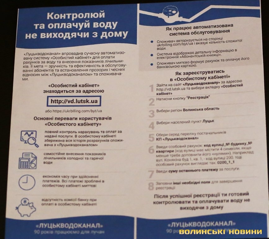 Шість способів передачі показників лічильників обліку спожитої води презентували представники «Луцькводоканалу»: тепер споживач зможе контролювати свої рахунки та оплачувати їх онлайн з будь-якої точки світу, не витрачаючи часу на черги чи спілкування з операторами по телефону.