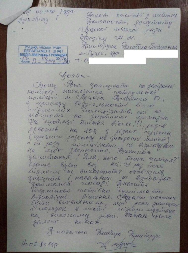 «Прошу заслухати на засіданні комісії начальника патрульної поліції Олександра Вовченка з приводу бездіяльності його підлеглих, які не реагують на звернення громадян. Впродовж тижня я 8 разів дзвонив на 102 з різних причин і ні разу поліція не відреагувала на звернення. За таких умов виникає питання: «Для чого патрульна поліція?».