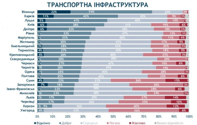 Місто лідирує з великим відривом від інших. У Харкові транспортну інфраструктуру добре оцінюють 53% мешканців.