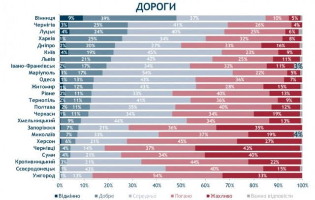 Транспортною інфраструктурою найбільше задоволені у Вінниці – аж 76% мешканців. І лише 4% незадоволені.