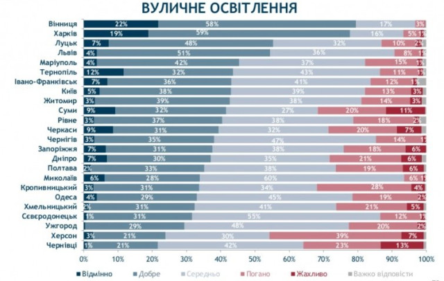 Найбільше своїм вуличним освітленням теж тішаться вінничани – 80%. Тоді як у Чернівцях цей сервіс добре оцінюють лише 22% містян.