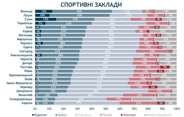 У рейтингу спортивних закладів також лідирує Вінниця. 54% містян називають їхній рівень добрим, майже такий же результат показують лучани – 53% задоволені спортивними закладами міста.