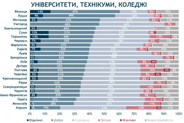 Найбільше незадоволені вищою освітою у своєму місті мешканці Херсона. 23% називають таке навчання поганим і лише 20% жителів – хорошим.