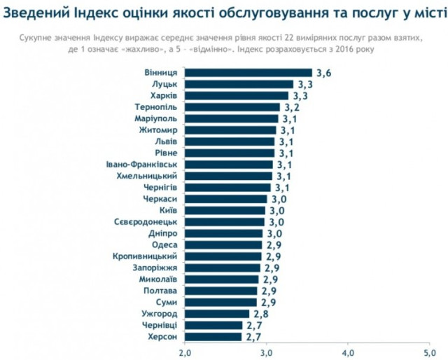 Як передає "Українська правда. Життя" четверте всеукраїнське муніципальне опитування показало, що найбільше якістю послуг у своєму місті задоволені вінничани, найбільш незадоволені – жителі Чернігова та Херсона.