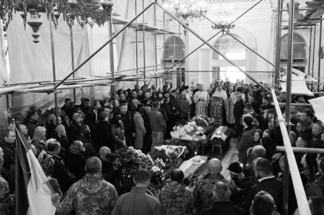 По завершенню богослужіння домовини з тілами Героїв під звуки дзвонів і солдатської сурми пронесли Театральним майданом. Біля фотостенду «Герої Небесної Сотні – Загинули за єдність України» скорботна процесія зупинилася і виконала Державний гімн.
