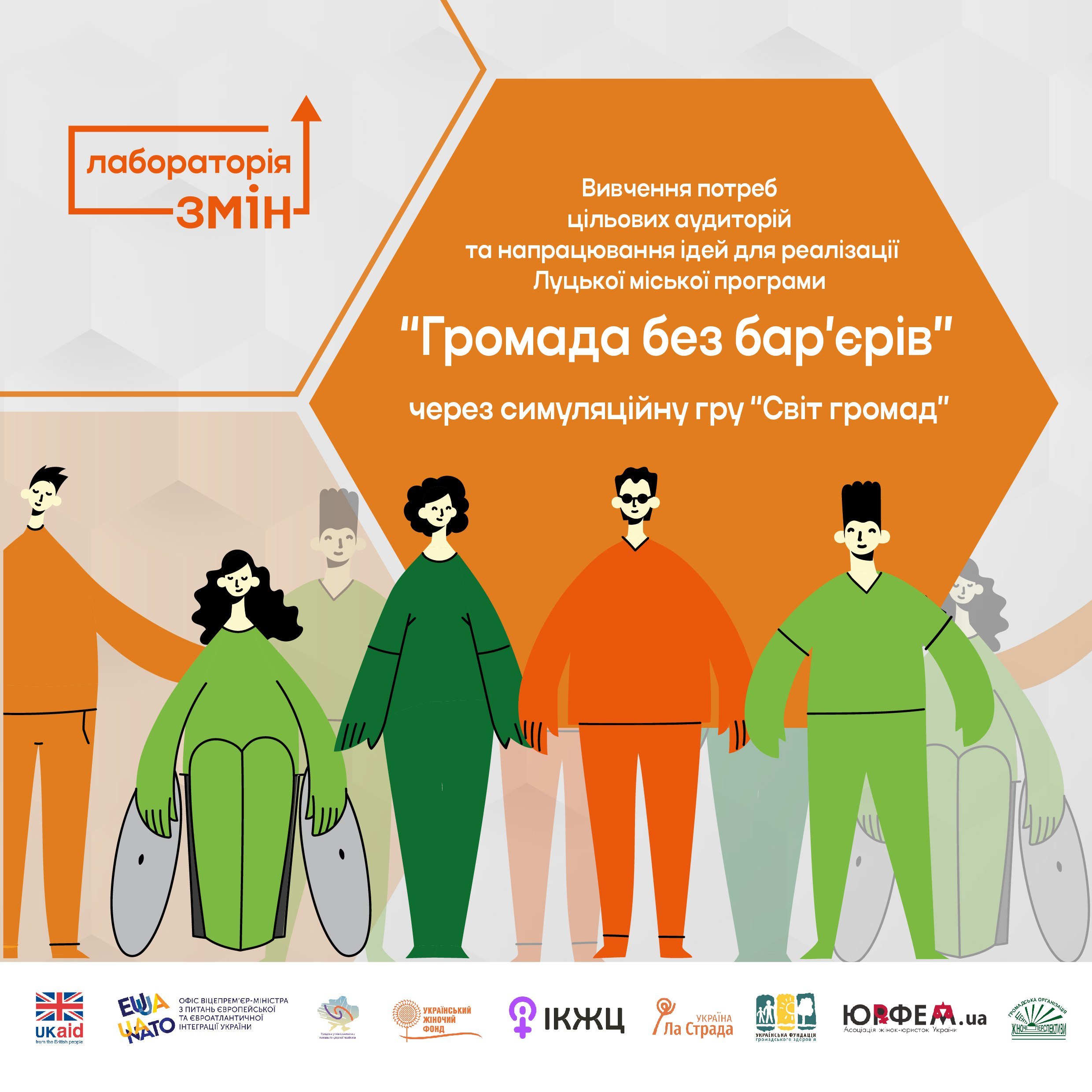 Проєкт «Вивчення потреб цільових аудиторій та напрацювання ідей для реалізації Луцької міської програми «Громада без бар’єрів» через симуляційну гру «Світ громад»» реалізувала ГО «Лабораторія Змін» завдяки фінансовій підтримці Уряду Великої Британії в межах проєкту «Жінки. Мир. Безпека»: відповіді на виклики війни«, який виконується Українським Жіночим Фондом у партнерстві з ГО «Ла Страда – Україна», Асоціацією жінок-юристок України «Юрфем», Інформаційно-консультаційним жіночим центром, Українською фундацією громадського здоров’я та Центром «Жіночі перспективи» за сприяння Офісу Віце-прем’єр-міністерки з питань європейської та євроатлантичної інтеграції та Апарату Урядової уповноваженої з питань ґендерної політики.