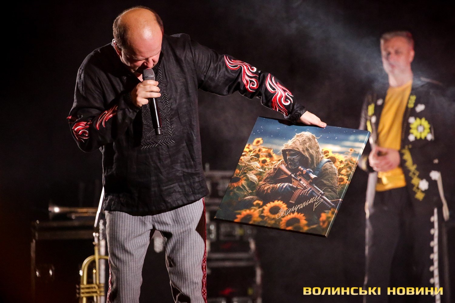 Спочатку він за 15 тисяч гривень продав марки Укрпошти з трактором, який тягне танк окупантів, з автографами учасників гурту ТІК та можливістю фото. Потім з молотка без торгу за 25 тисяч гривень пішла картина українського бійця з підписом Головнокомандувача ЗСУ Валерія Залужного, яку переможець вирішив повернути для ще одного аукціону. Однак гурт не став везти її на наступний концерт, а продав у Луцьку за 15 тисяч. Фінальним лотом стала гітара з підписами учасників гурту, яку придбали за 23 тисячі гривень.Після аукціону «ТІК продовжив звучати, а Вітька співати». Лучани запалили у залі під «Білі троянди», потім підспівували «Не цілуй», яку ТІК виконує з Іриною Білик.