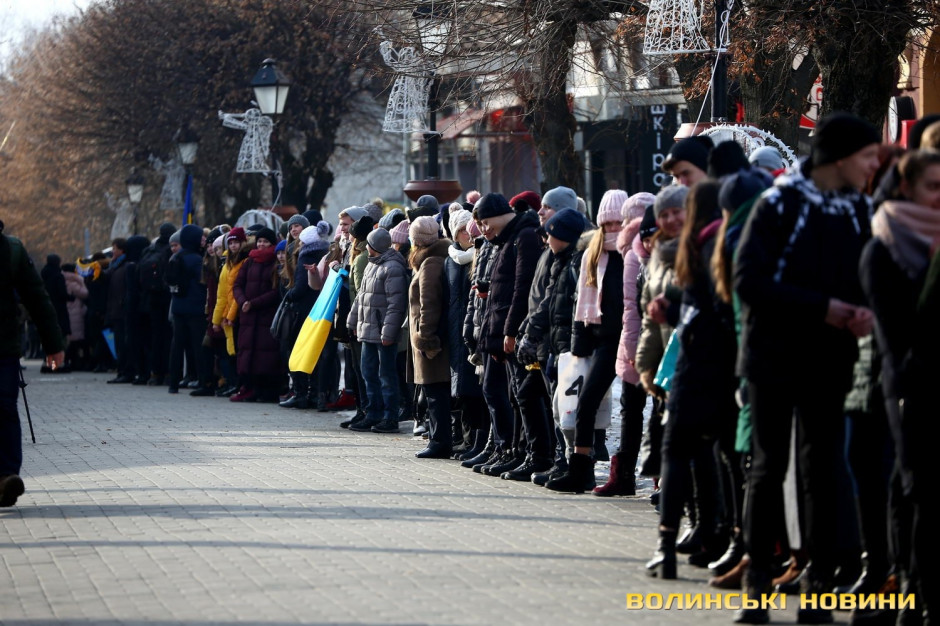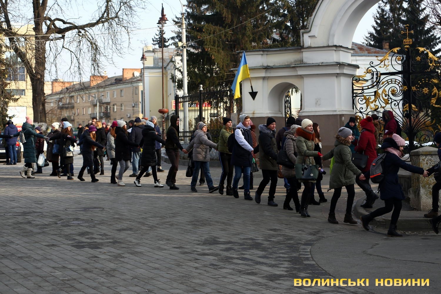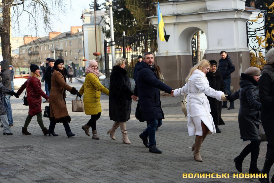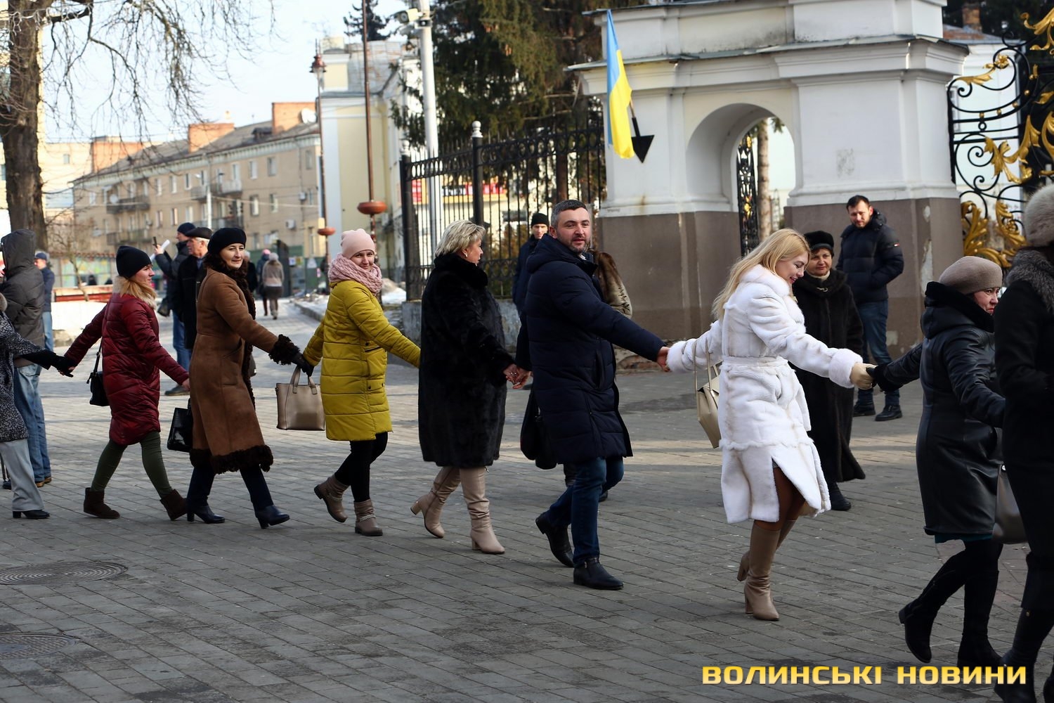 Так, о 12 годині на Театральному майдані зібралися сотні лучан, аби утворити живий ланцюг. Варто зазначити, що чимало з них мали українську символіку.