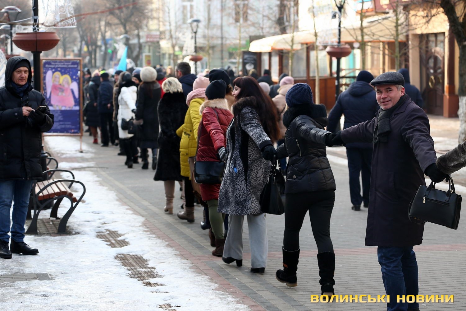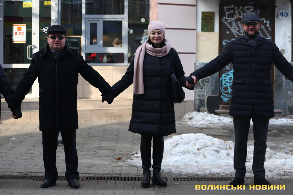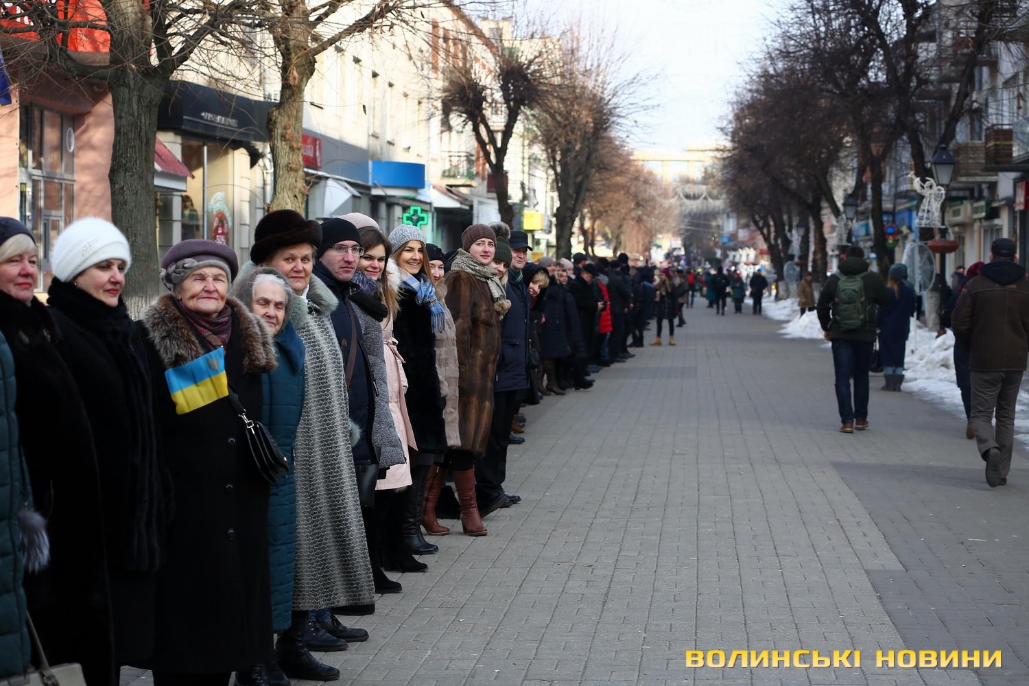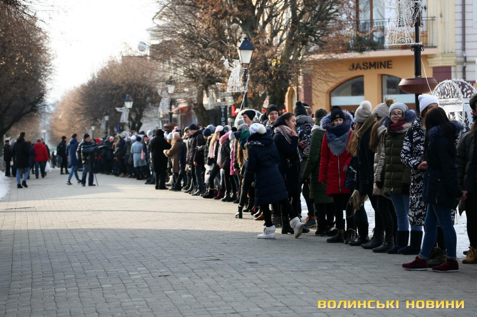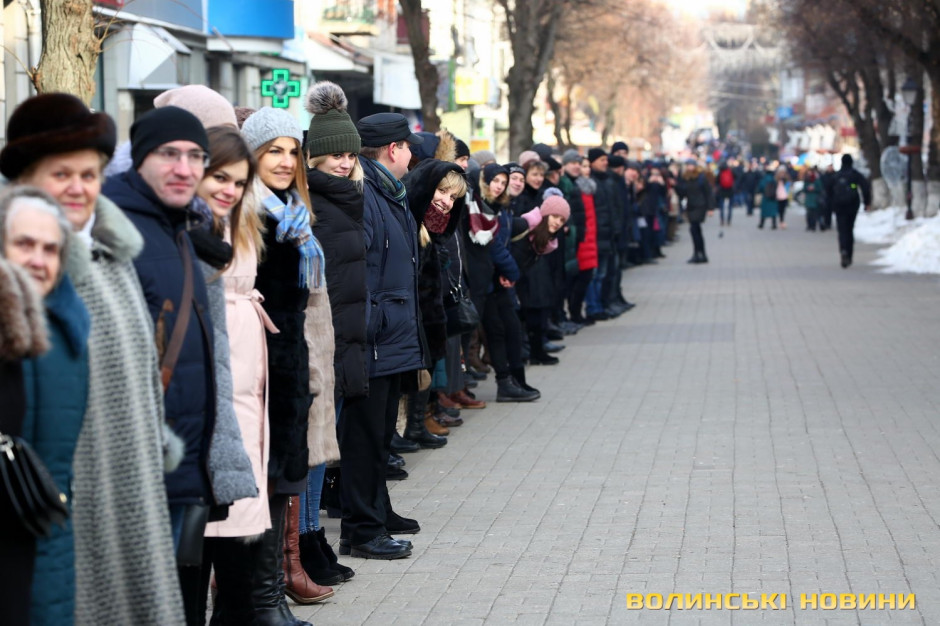 Так, о 12 годині на Театральному майдані зібралися сотні лучан, аби утворити живий ланцюг. Варто зазначити, що чимало з них мали українську символіку.
