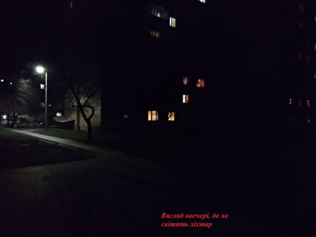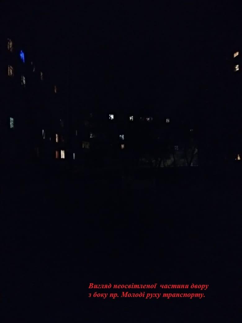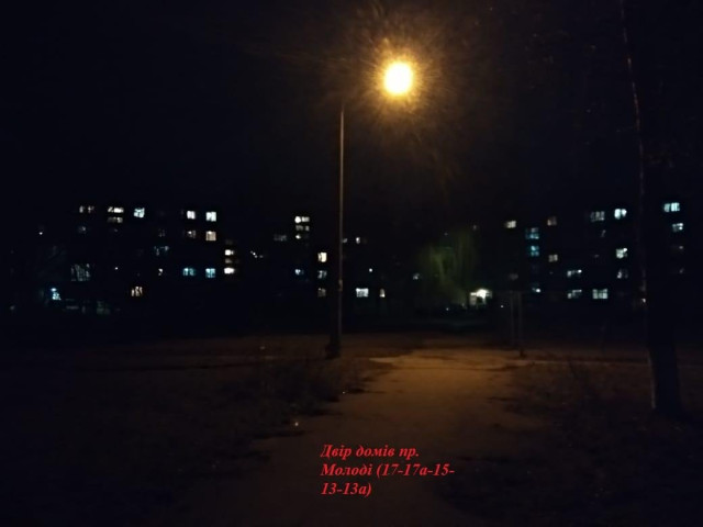 «Ліхтарі, які там знаходяться, мають дуже погане освітлення, один не працює повністю. Крім того, з боку будинків на проспекті Молоді, 17, 19 та 19а розміщені два ліхтарі, які не працюють», – зазначила жінка.