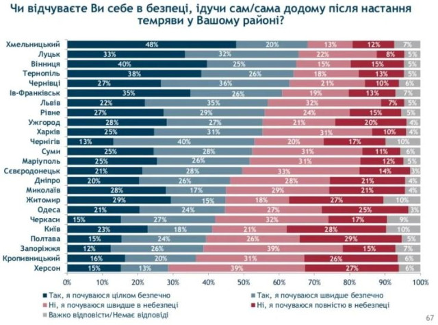 Найгірше ситуацію з безпекою в своєму місті оцінюють жителі Херсона — повністю в небезпеці або скоріше в небезпеці з настанням темряви відчувають себе 66% опитаних.