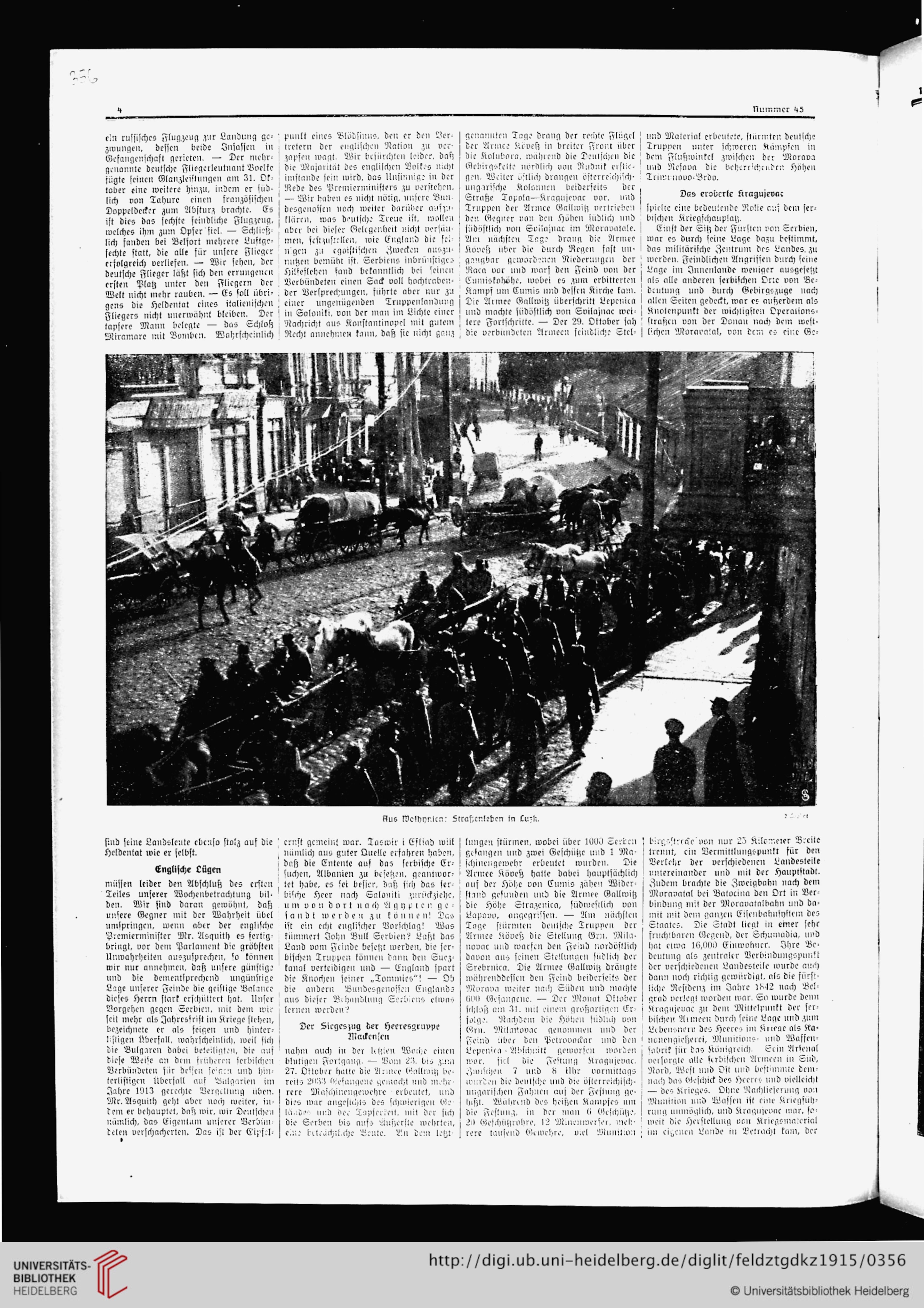 Фотографію з Луцьком знайдемо в ілюстрованому тижневику Deutsche Kriegszeitung за 7 листопада 1915 року. Вона ілюструє прохід австро-угорських солдатів Головною вулицею. Колона звертає біля будинків Марка та Іллі Кронштейнів на теперішню вулицю Ковельську біля Базиліанського мосту. Під фото підпис готичним шрифтом «Aus Wolhynien: Straßenleben in Luzk» (З Волині: вуличне життя в Луцьку). Віденський історик Антон Гольцер стверджує, що це фото Олександра Ексакса.