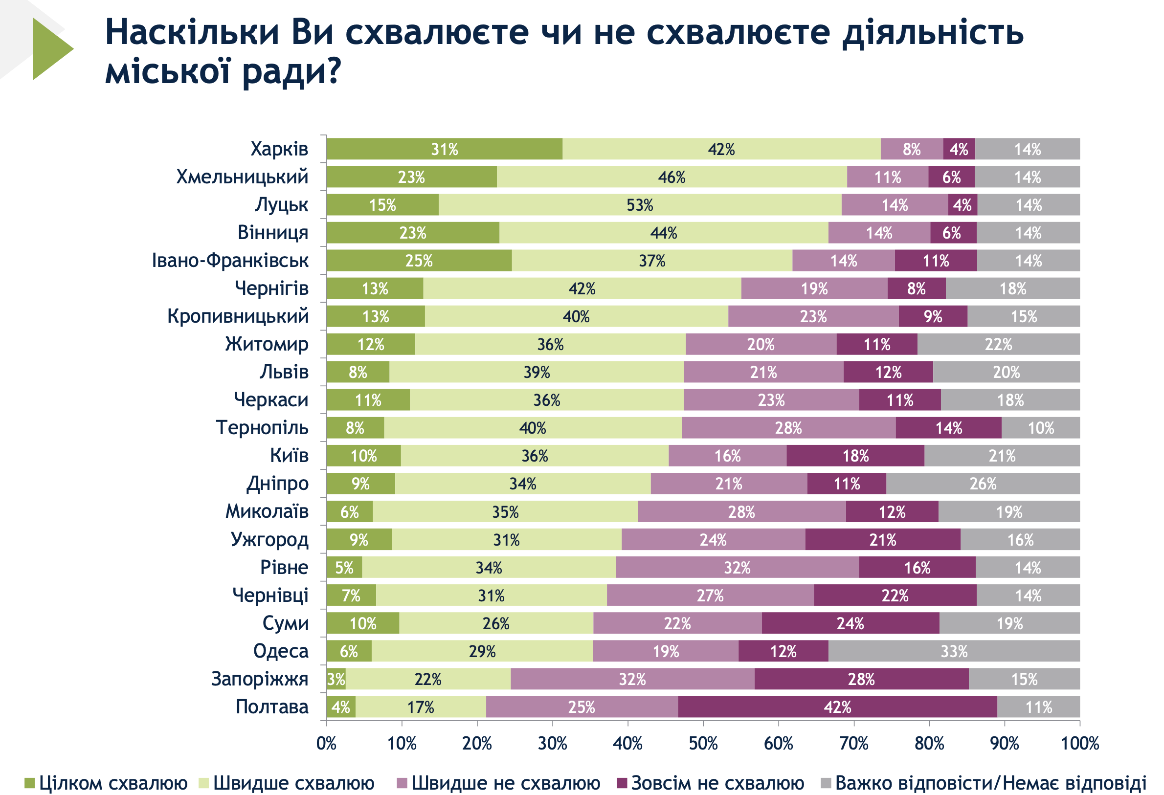Це опитування дає усесторонній аналіз ставлення громадян до органів місцевого самоврядування та надання комунальних послуг.Відповідно до результатів опитування, в Луцьку склалася найкраща ситуація з такими послугами чи сферами, як якість облаштування бомбосховищ, школи, дитячі садки, розвиток промисловості та діяльність поліції. Обласний центр Волині другий-третій серед 21 міста країни за показниками, як-то збір сміття, медичні заклади, транспортна інфраструктура, громадський транспорт, вуличне освітлення, університети, технікуми, коледжі та постачання газу.