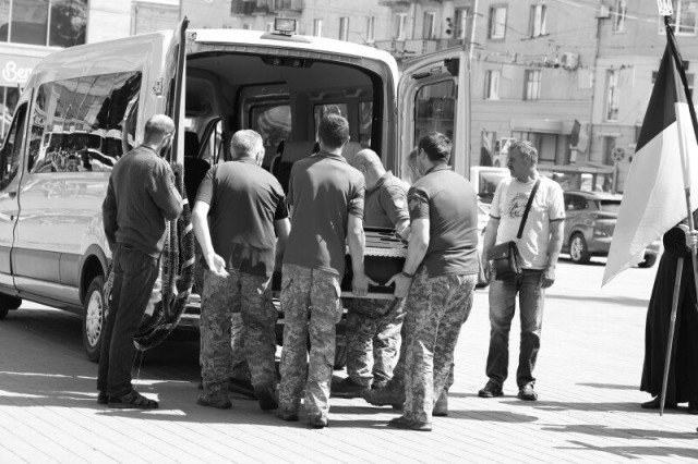 Загиблого воїна пронесли Театральним майданом, лучани стали на коліна і схилили голови у скорботі. Біля фотостенду «Герої Небесної Сотні – Загинули за єдність України» виконали Державний Гімн України.