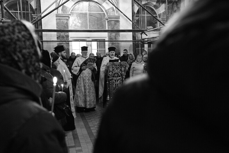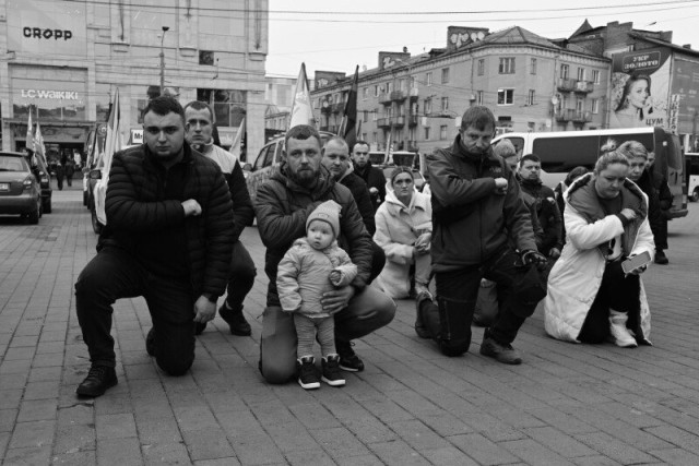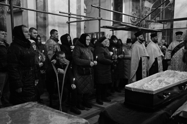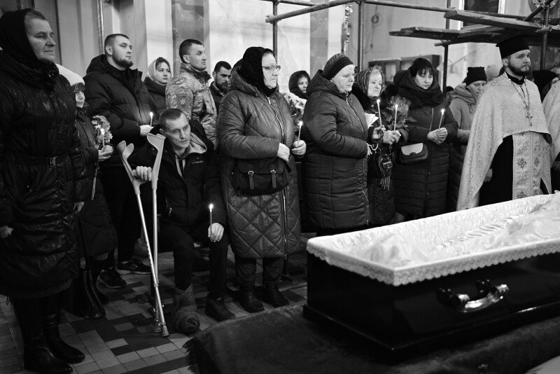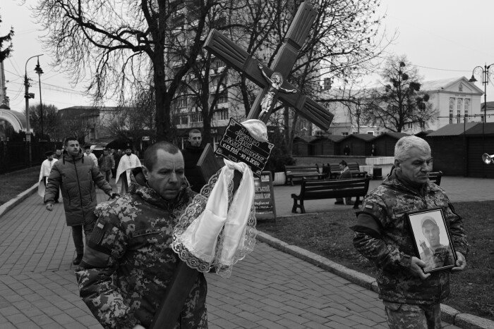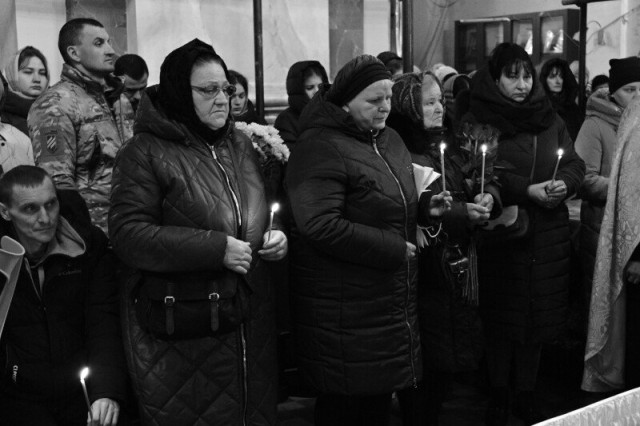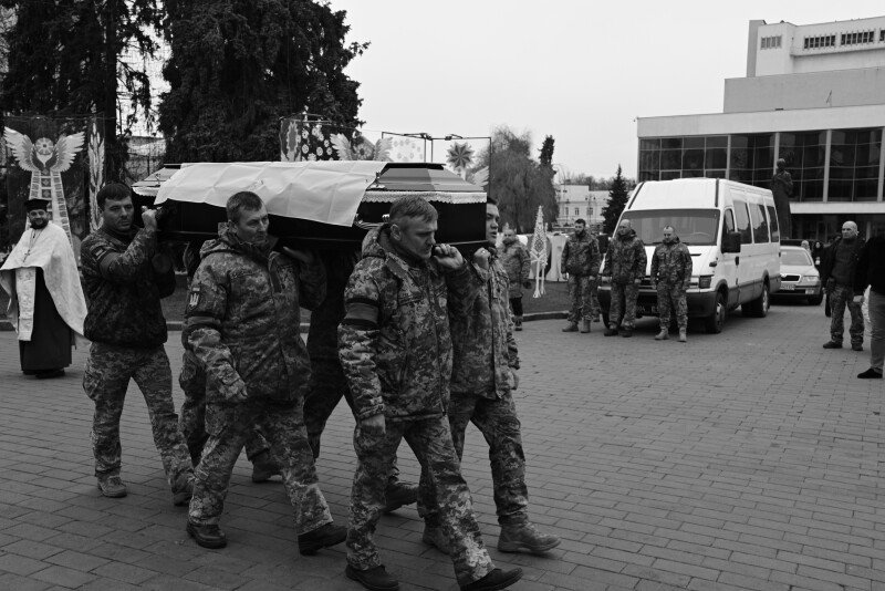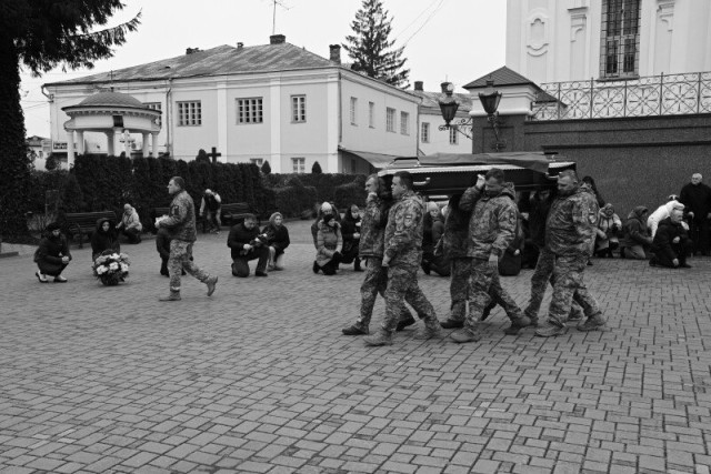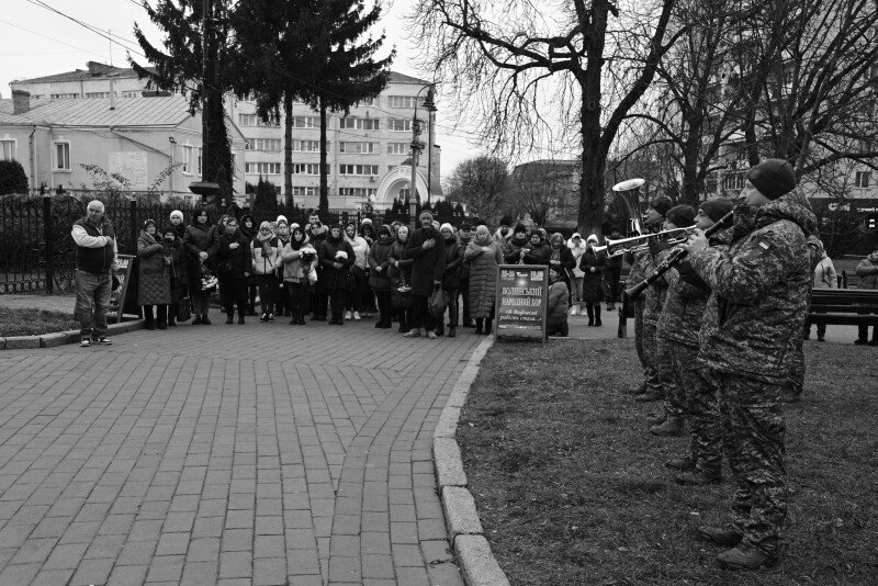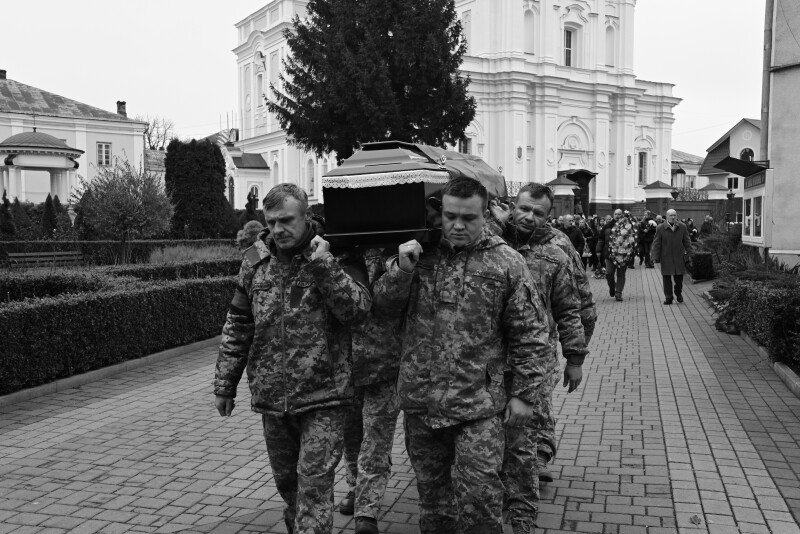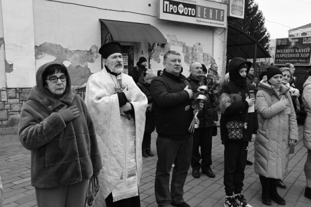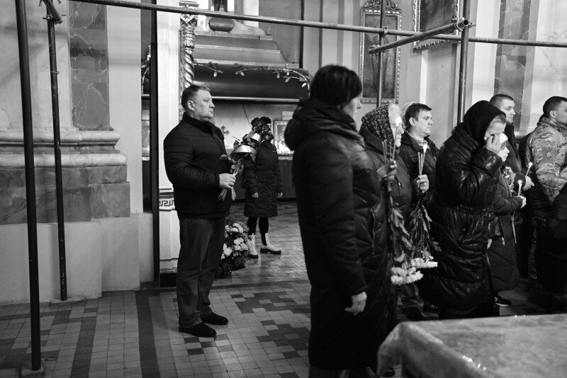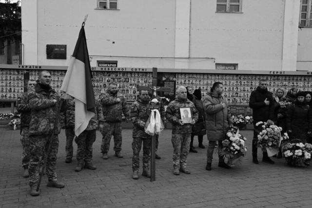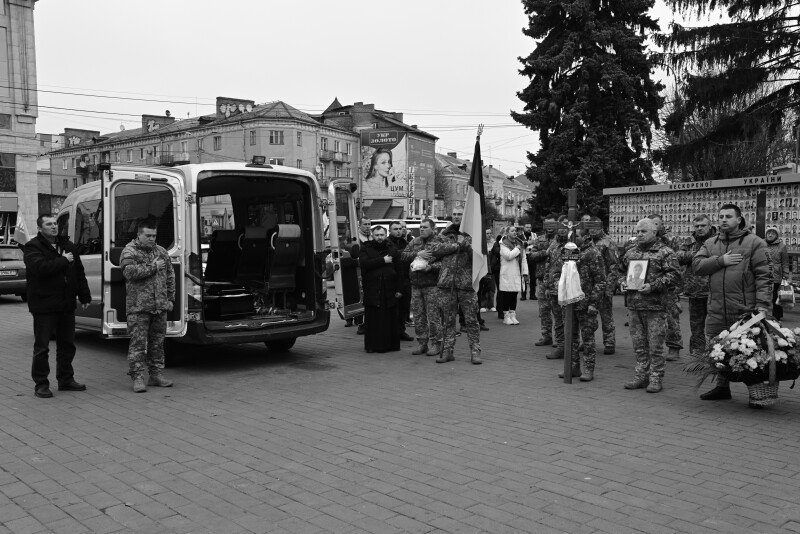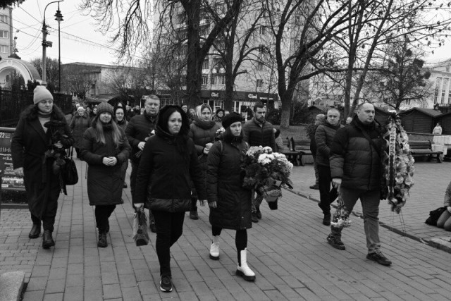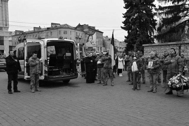 Після завершення богослужіння труну з тілом покійного захисника пронесли Театральним майданом. Біля пам’ятного фотостенда загиблим Героям присутні зупинилися і виконали Державний Гімн України.
