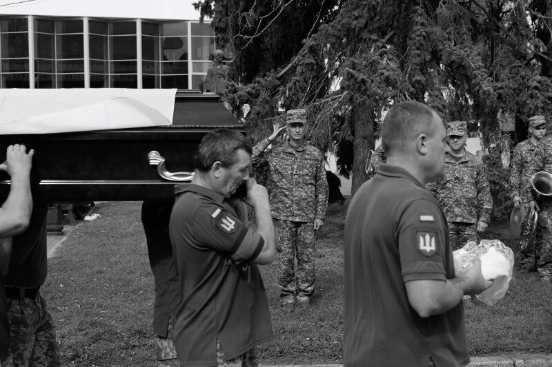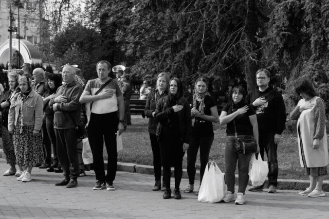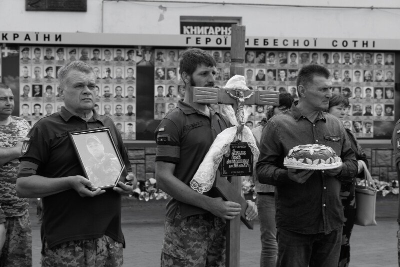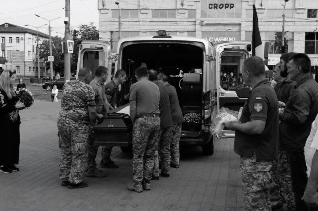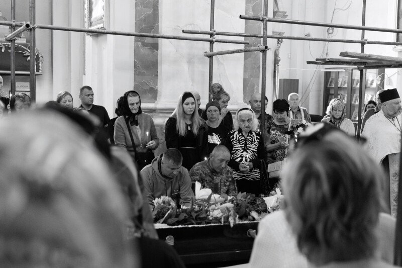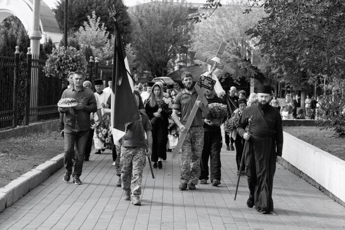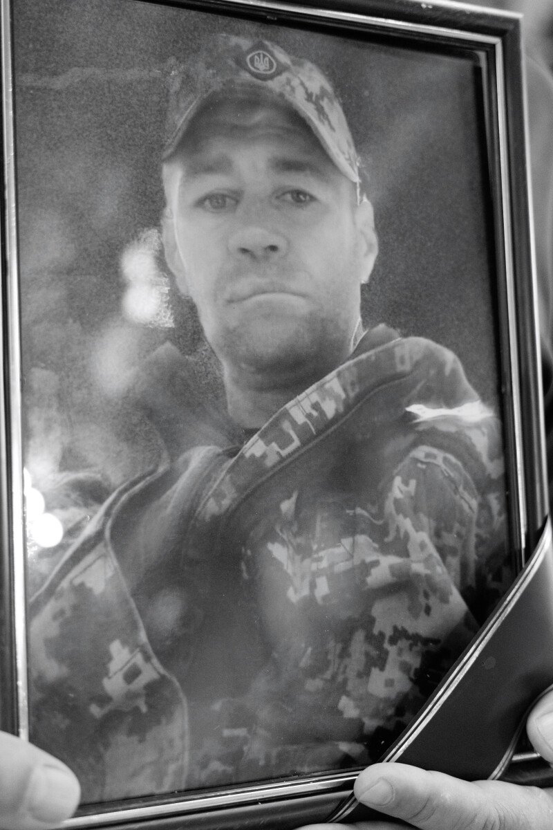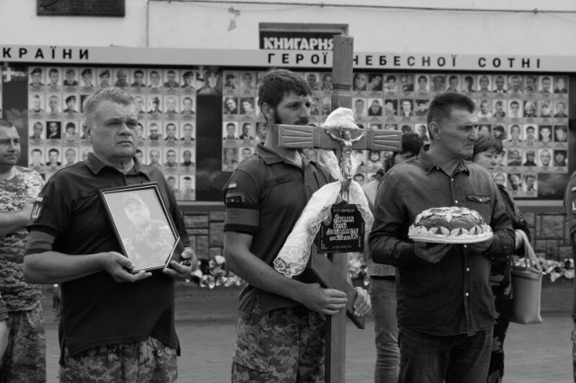 Після завершення богослужіння труну з тілом покійного захисника пронесли Театральним майданом. Біля фотостенда пам’яті загиблих Героїв присутні зупинилися і виконали Державний Гімн України.