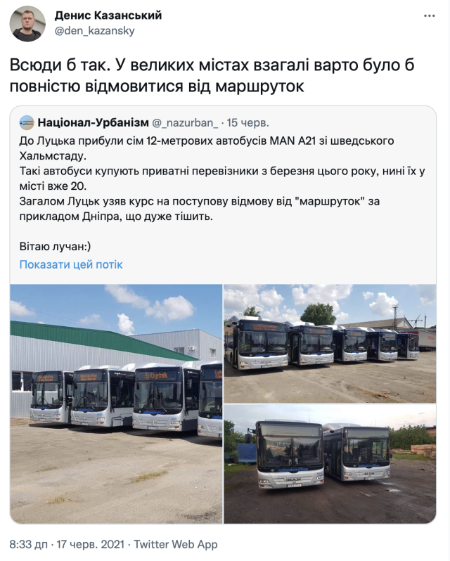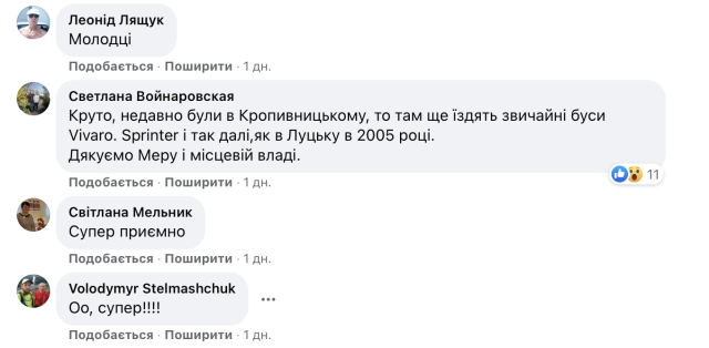 Ініціативу відмовитися від набридливих маршруток підтримують не тільки лучани. Зокрема, Луцьк у приклад ставлять Дніпру, Києву, Миколаєву, Кропивницькому та іншим містам.Окрім того, в соціальних мережах деякі лучани переконують, що готові платити за проїзд у комфортному громадському транспорті більше (навіть 10 гривень).Замість P. S.