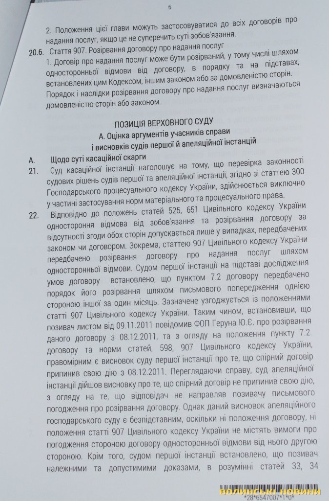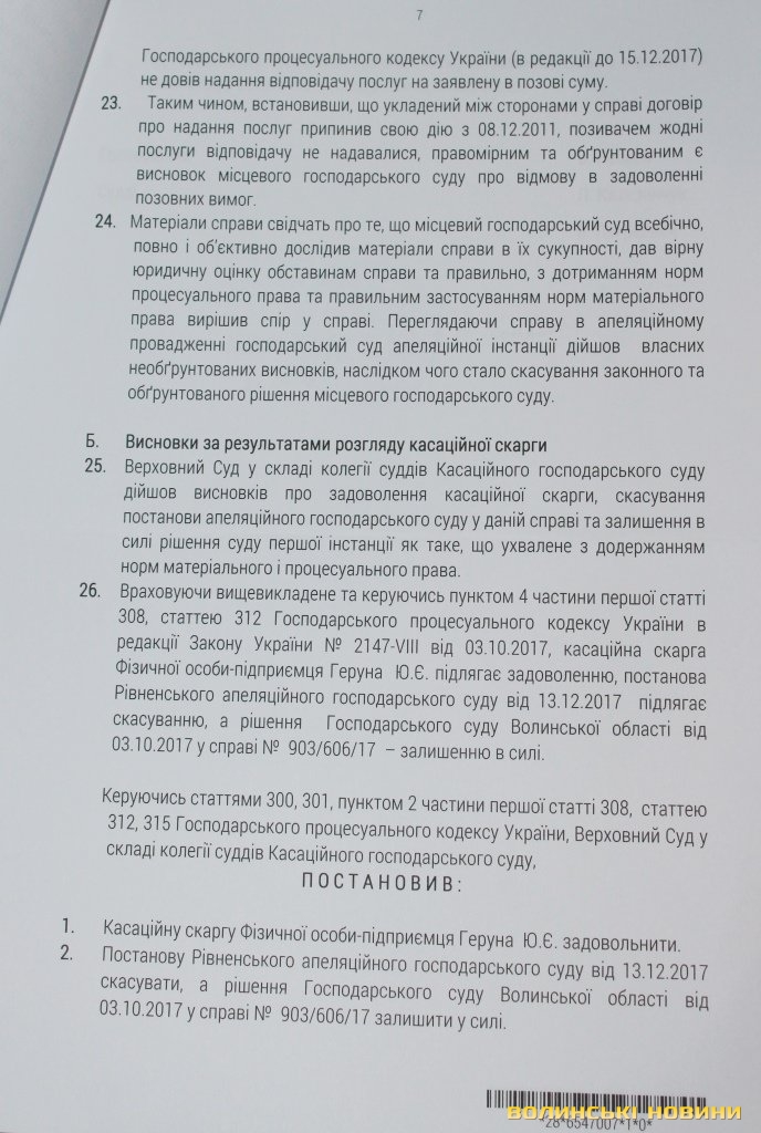 Отже, як встановив Верховний Суд, Апеляційний господарський суд Рівненської області дійшов необґрунтованих висновків, наслідком чого стало скасування законного та обґрунтованого рішення місцевого господарського суду. Верховний Суд 15 травня цього року задовольнив касаційну скаргу, скасував постанову апеляційного господарського суду та залишив у силі рішення суду першої інстанції як таке, що ухвалене з додержанням норм матеріального і процесуального права.