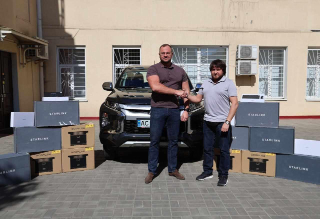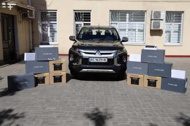Поставка включає в себе 7 супутникових модемів Starlink, 5 зарядних станцій EcoFlow Delta Max, 5 броньованих планшетів OUKITEL і автомобіль Mitsubishi L200.