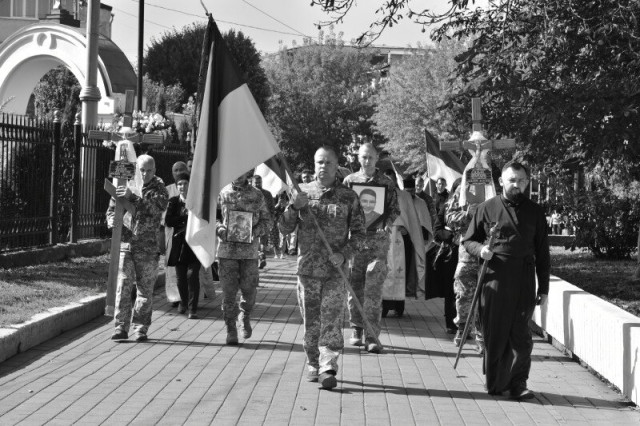 Біля фотостенду «Герої Небесної Сотні – Загинули за єдність України» скорботна процесія зупинилася і виконала Державний Гімн.