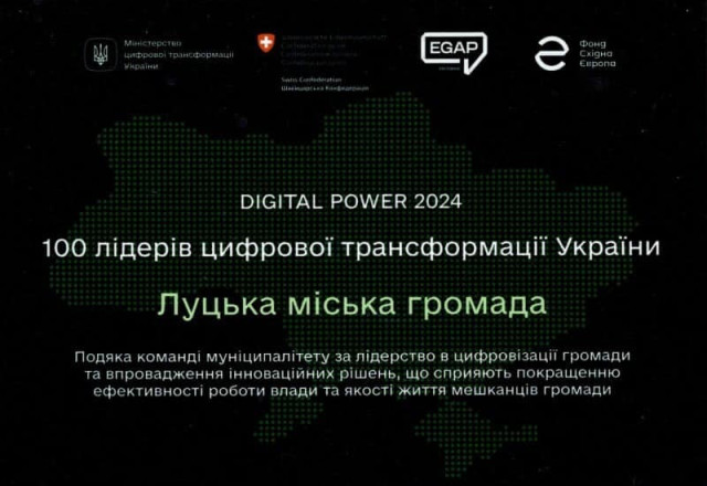 Луцька громада отримала почесну відзнаку – подяку команді міської ради за лідерство в цифровізації громади та впровадження інноваційних рішень, що сприяють покращенню ефективності роботи влади та якості життя жителів громади.