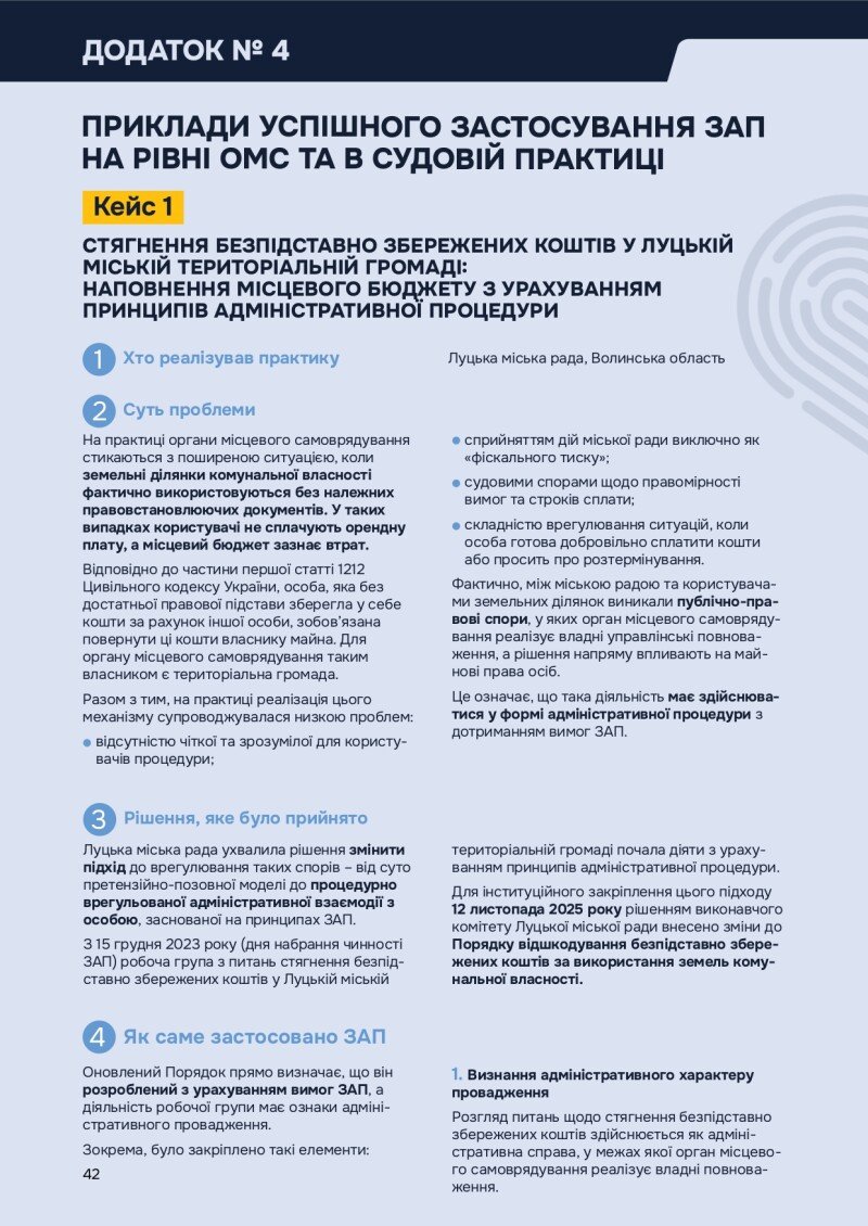 Зокрема, у звіті наведено кейс Луцької міської територіальної громади щодо стягнення безпідставно збережених коштів за використання земель комунальної власності з урахуванням принципів адміністративної процедури.