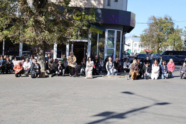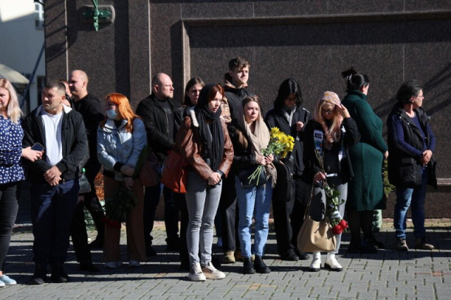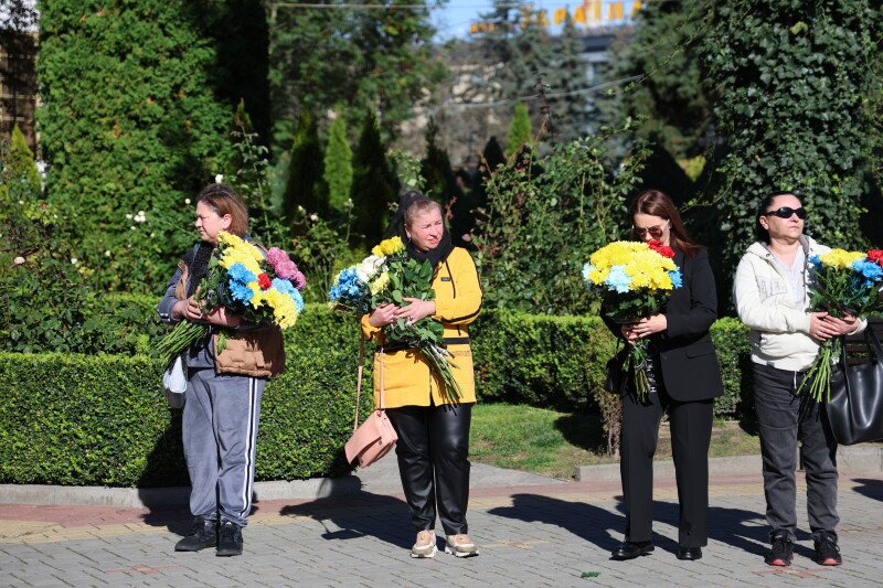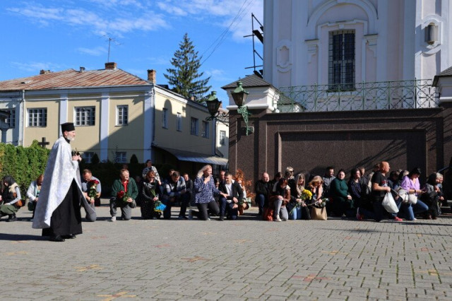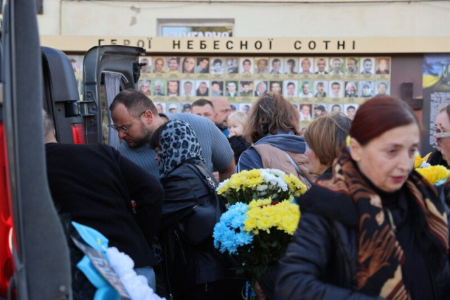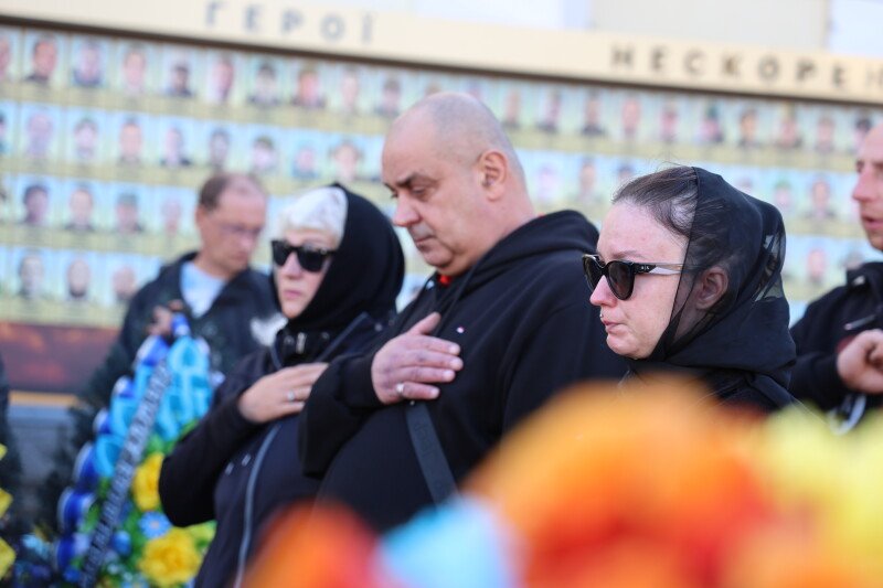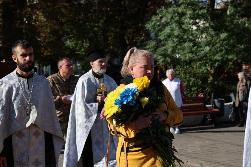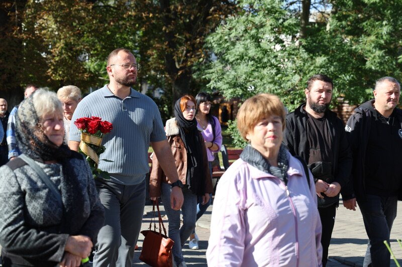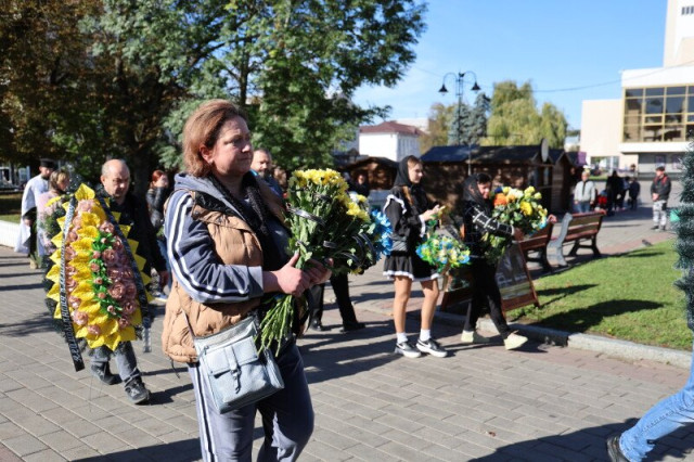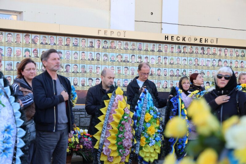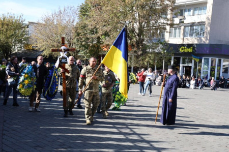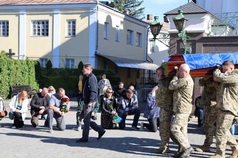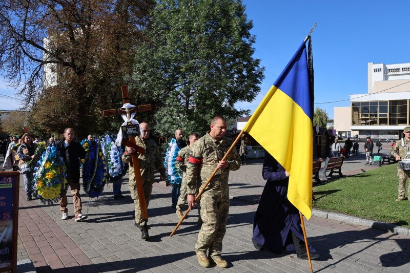 Після завершення богослужіння труну з тілом покійного захисника пронесли Театральним майданом. Біля фотостенда пам’яті загиблих Героїв присутні зупинилися і виконали Державний Гімн України.