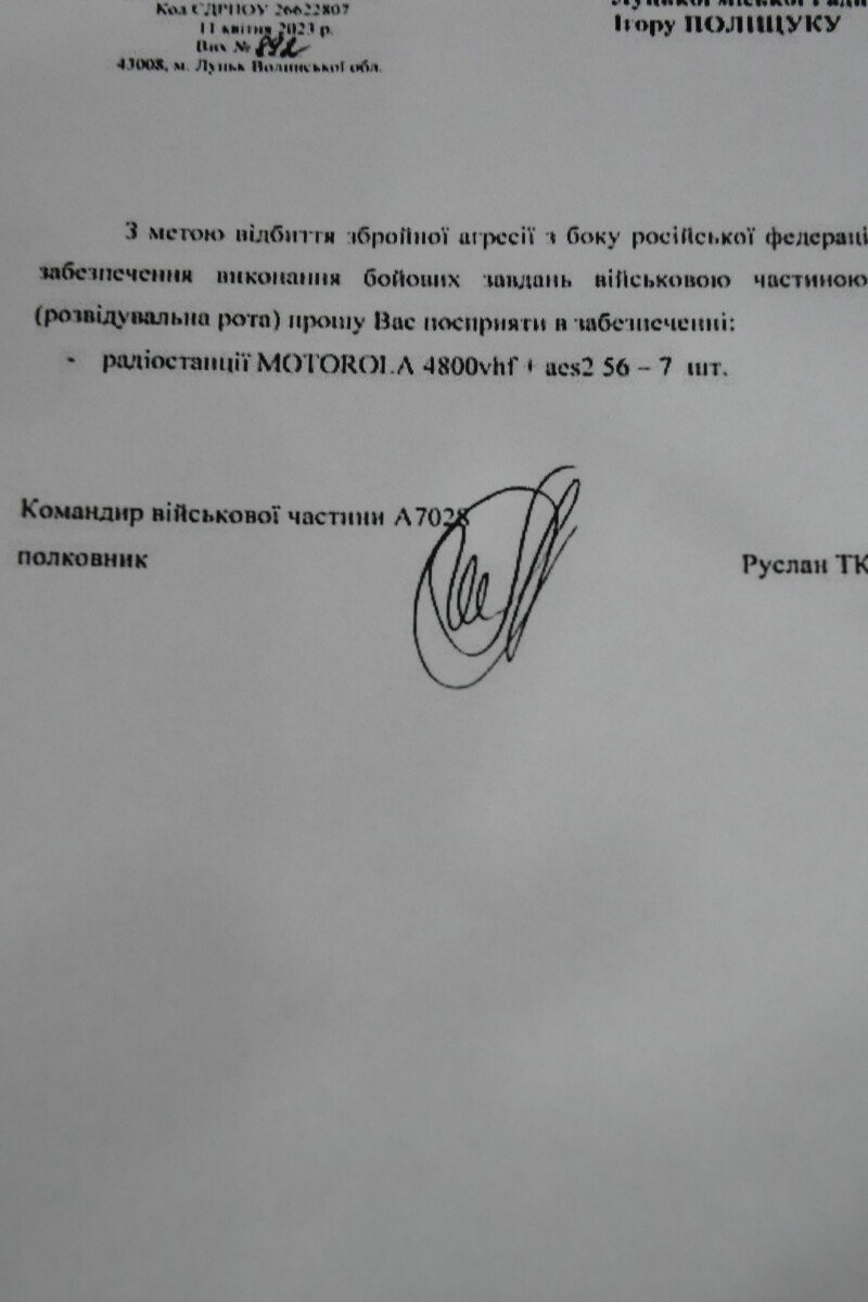 Очільник Луцької громади одразу відгукнувся на прохання лучанки. Виділив понад 200 тисяч гривень на потреби тих, хто наразі перебуває на передовій. Рації волонтери шукали три тижні, адже вимоги до них були особливі: це мала бути портативна радіостанція MOTOTRBO DP4800, що є інноваційною розробкою бренду Motorola. Діапазон частот пристрою – 136-174 МГц (VHF), кількість каналів – 1000, тип АКБ Li-Ion, радіус дії – до 25 км.