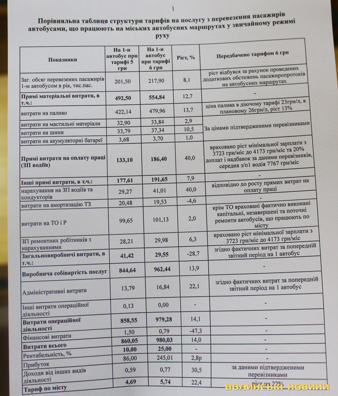 Проект рішення підготували відповідно до звернень луцьких перевізників, які надали відповідні розрахунки. Так, у діючому тарифі врахована вартість палива на рівні 23 гривень за літр, у плановому - 26 гривень, витрати на оплату праці водіїв були враховані на рівні 22,4 гривні на годину, у плановому - 33,58 гривні. Також значно збільшилися нарахування на заробітну плату водіїв. Рентабельність у плановому тарифі становить 25%, у наявному 10%. Розрахунковий тариф, таким чином, становить 5,74 гривні.Своєю чергою, директор АТП 10701 Сергій Дьомін, відзначив, що наразі йдеться не про вартість проїзду, а про розрахунковий тариф. Перевізники неодноразово надавали свої розрахунки тарифу і вони передбачають значно вищий тариф, ніж нині. Це відбувається через три ключові фактори: вартість пального, амортизаційні відрахування та заробітна плата водіїв. Так, в плановому тарифі закладена вартість пального на рівні 26 гривень – це вже реальність для перевізників.