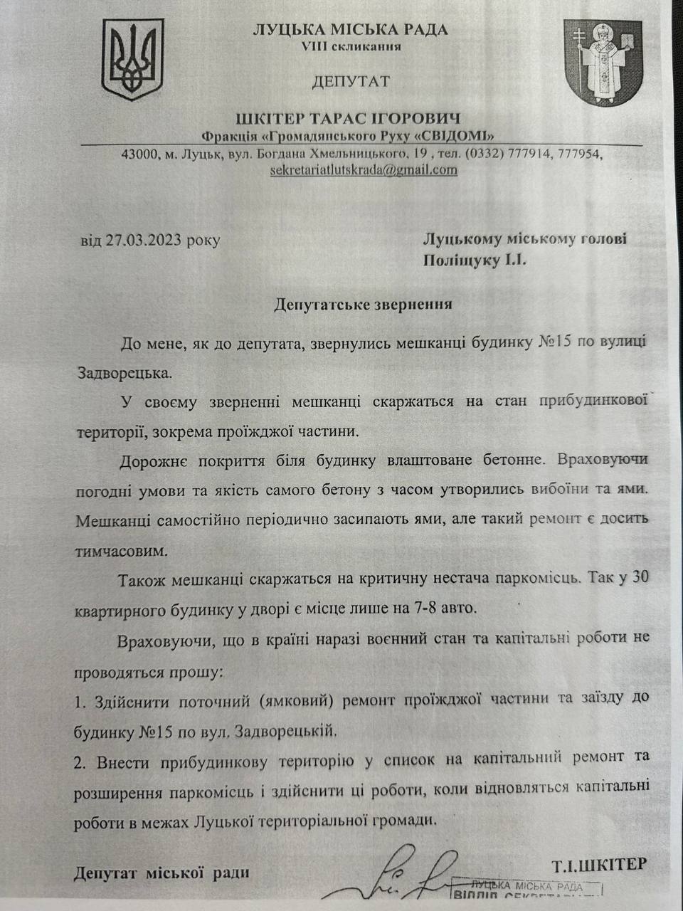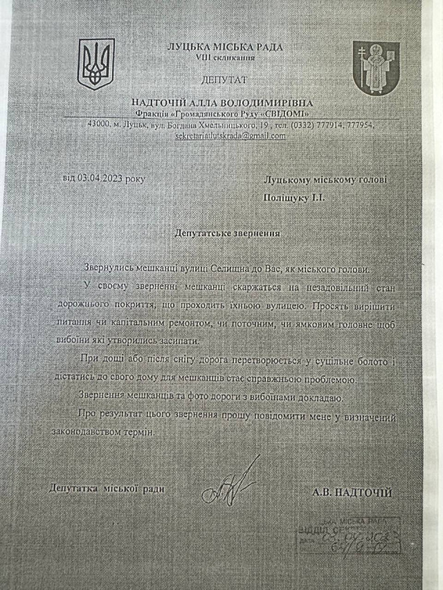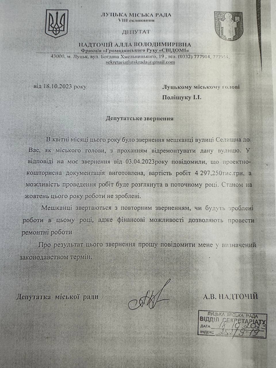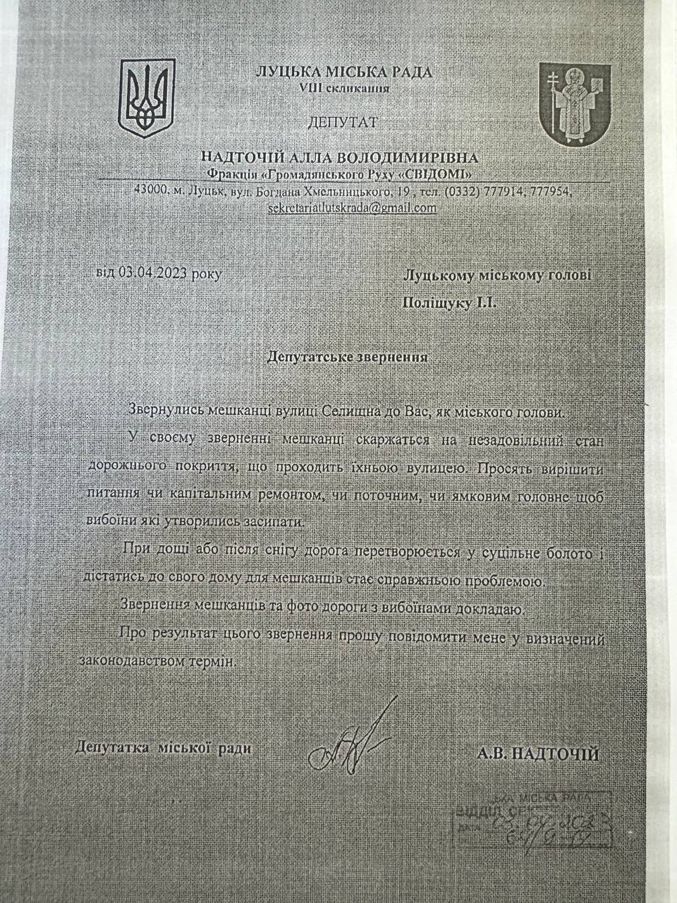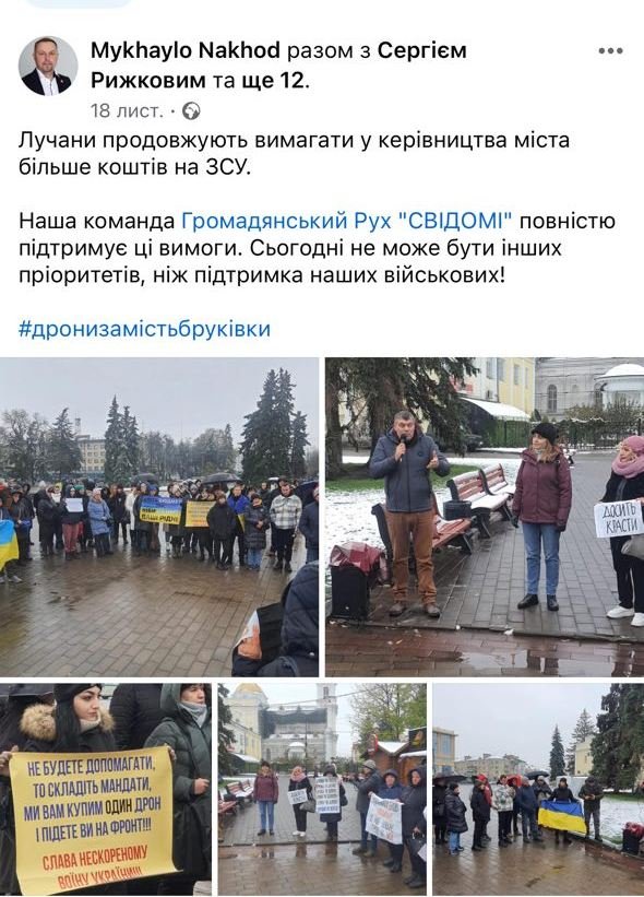 «Лучани продовжують вимагати у керівництва міста більше коштів на ЗСУ. Наша команда Громадянський Рух «Свідомі» повністю підтримує ці вимоги. Сьогодні не може бути інших пріоритетів, ніж підтримка наших військових», – переконує депутат Луцької міської ради від «Свідомих» Михайло Наход.Подібно висловлювалася і депутатка фракції «Свідомі» у Луцькраді Алла Надточій: «Лучани не вірять рішенням та обіцянкам мера Поліщука! Тому акції у центрі міста продовжуються і люди будуть виходити надалі, щоб контролювати ситуацію та шукати рішення, як можна ще більше допомагати нашим захисникам. Громадськість буде продовжувати акції на центральній площі Луцька і закликають усіх доєднуватися! Тому що чим більше людей висловлюватиме свою позицію, тим швидше почне дослухатися влада».Вона писала, що жителі кожної громади мають вимагати максимум від своїх керівників. Адже гроші в бюджетах є, і треба, мовляв, докласти максимум зусиль, аби їх левова частина скеровувалась на підтримку ЗСУ. Однак Алла Надточій «забула», що у жовтні в депутатському зверненні до Луцького міського голови Ігоря Поліщука просила відремонтувати вулицю Героїв УПА та надати відповідь, чому досі не відремонтована вулиця Селищна, щодо якої вона зверталася у квітні, мовляв, фінансові можливості дозволяють провести ремонтні роботи.Ще одну вулицю вона просила відремонтувати у березні, йдеться про вулицю Вільхову. Заради справедливості відзначимо, що тоді питання виділення коштів з місцевих бюджетів на ЗСУ було не таким резонансним, як зараз.Колега Алли Надточій по фракції Андрій Лучик також у квітні-червні в депутатських запитах просив відремонтувати три вулиці: вулицю Воїнів-Афганців, частину вулиці Кравчука та облаштувати тротуар на вулиці Ветеранів поруч з держархівом.Депутат «Свідомих» Тарас Шкітер відзначився двома депутатськими запитами щодо ремонту в березні. Він просив відремонтувати прибудинкову територію на вулиці Задворецькій, 15 та частину вулиці Привокзальної.Відтак однією рукою «Свідомі» пишуть дописи про необхідність спрямовувати більше коштів на ЗСУ, а іншою – запити з проханнями відремонтувати потрібні вулиці. Дії, які суперечать одна одній, мають і свою логіку: вочевидь, таким чином депутати намагаються водночас не втратити обличчя перед виборцями, але й відстояти бізнес-інтереси їх власника Андрія Покровського щодо незаконної земельної оборудки на вулиці Метельницького, 3.