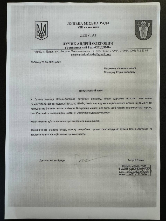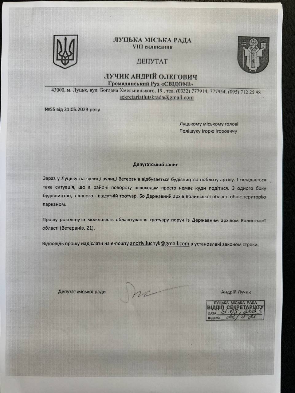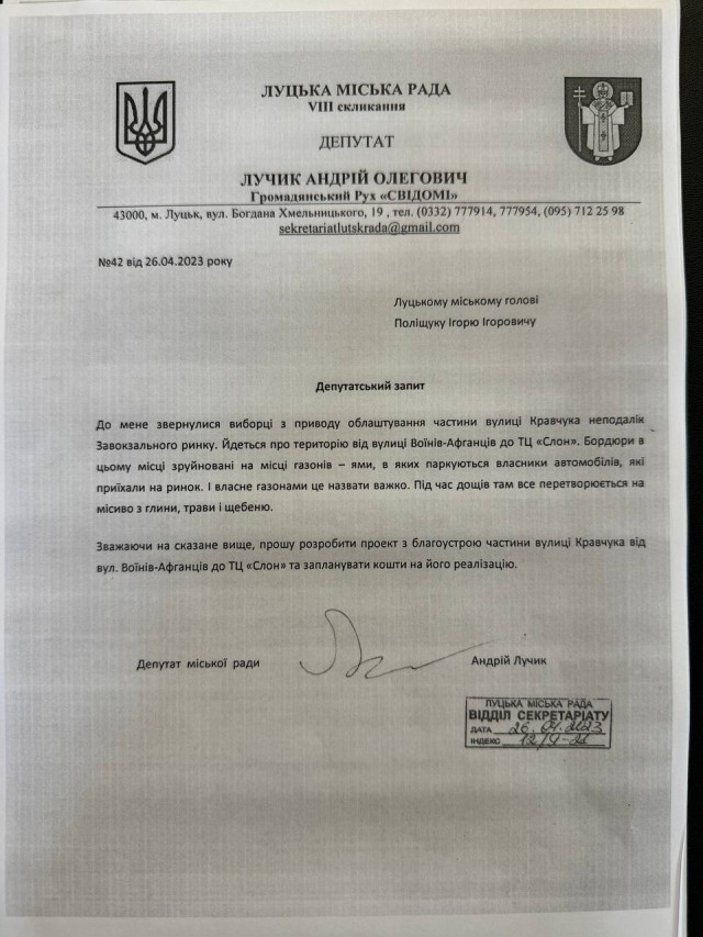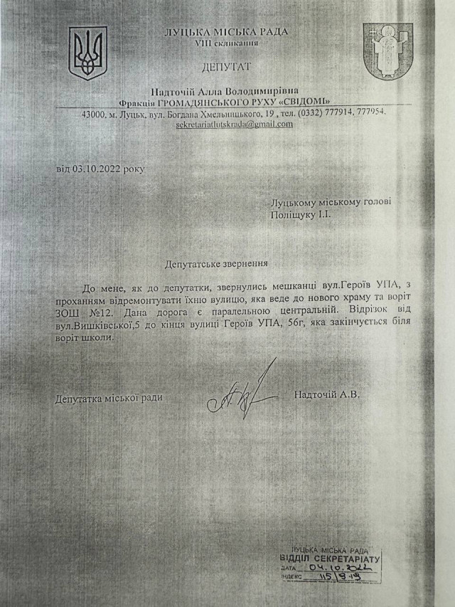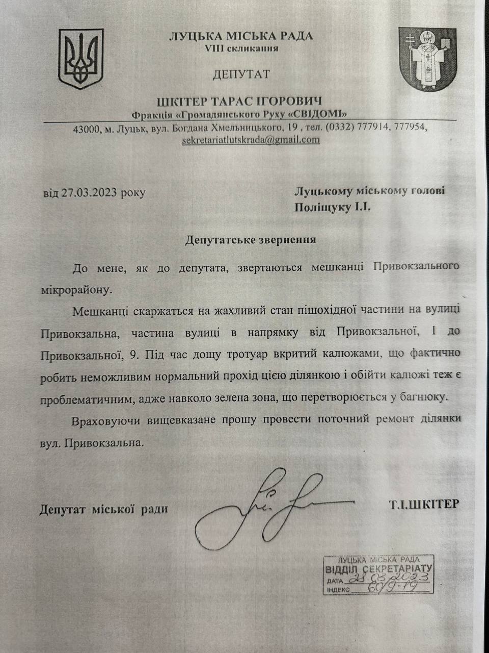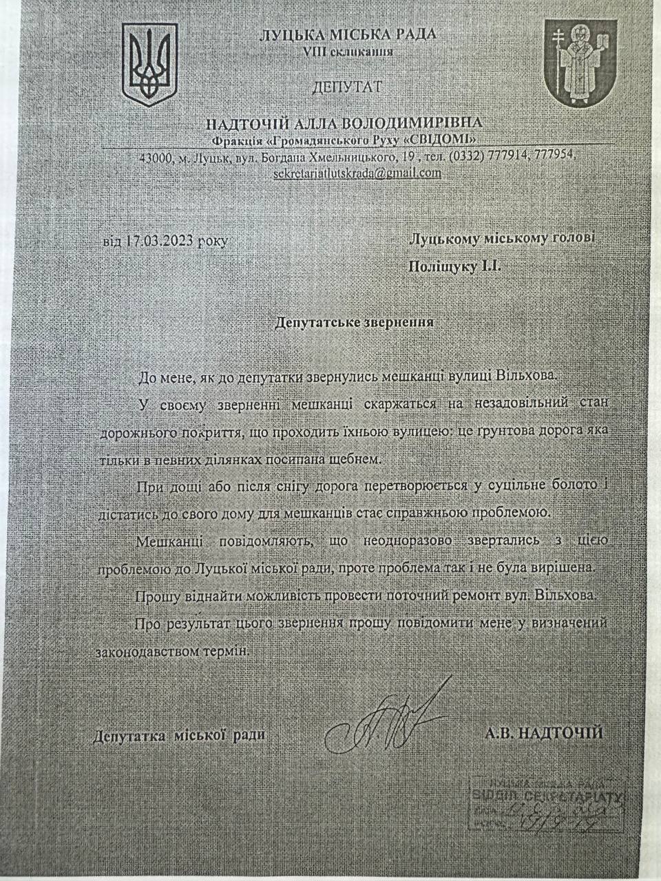 «Лучани продовжують вимагати у керівництва міста більше коштів на ЗСУ. Наша команда Громадянський Рух «Свідомі» повністю підтримує ці вимоги. Сьогодні не може бути інших пріоритетів, ніж підтримка наших військових», – переконує депутат Луцької міської ради від «Свідомих» Михайло Наход.Подібно висловлювалася і депутатка фракції «Свідомі» у Луцькраді Алла Надточій: «Лучани не вірять рішенням та обіцянкам мера Поліщука! Тому акції у центрі міста продовжуються і люди будуть виходити надалі, щоб контролювати ситуацію та шукати рішення, як можна ще більше допомагати нашим захисникам. Громадськість буде продовжувати акції на центральній площі Луцька і закликають усіх доєднуватися! Тому що чим більше людей висловлюватиме свою позицію, тим швидше почне дослухатися влада».Вона писала, що жителі кожної громади мають вимагати максимум від своїх керівників. Адже гроші в бюджетах є, і треба, мовляв, докласти максимум зусиль, аби їх левова частина скеровувалась на підтримку ЗСУ. Однак Алла Надточій «забула», що у жовтні в депутатському зверненні до Луцького міського голови Ігоря Поліщука просила відремонтувати вулицю Героїв УПА та надати відповідь, чому досі не відремонтована вулиця Селищна, щодо якої вона зверталася у квітні, мовляв, фінансові можливості дозволяють провести ремонтні роботи.Ще одну вулицю вона просила відремонтувати у березні, йдеться про вулицю Вільхову. Заради справедливості відзначимо, що тоді питання виділення коштів з місцевих бюджетів на ЗСУ було не таким резонансним, як зараз.Колега Алли Надточій по фракції Андрій Лучик також у квітні-червні в депутатських запитах просив відремонтувати три вулиці: вулицю Воїнів-Афганців, частину вулиці Кравчука та облаштувати тротуар на вулиці Ветеранів поруч з держархівом.Депутат «Свідомих» Тарас Шкітер відзначився двома депутатськими запитами щодо ремонту в березні. Він просив відремонтувати прибудинкову територію на вулиці Задворецькій, 15 та частину вулиці Привокзальної.Відтак однією рукою «Свідомі» пишуть дописи про необхідність спрямовувати більше коштів на ЗСУ, а іншою – запити з проханнями відремонтувати потрібні вулиці. Дії, які суперечать одна одній, мають і свою логіку: вочевидь, таким чином депутати намагаються водночас не втратити обличчя перед виборцями, але й відстояти бізнес-інтереси їх власника Андрія Покровського щодо незаконної земельної оборудки на вулиці Метельницького, 3.
