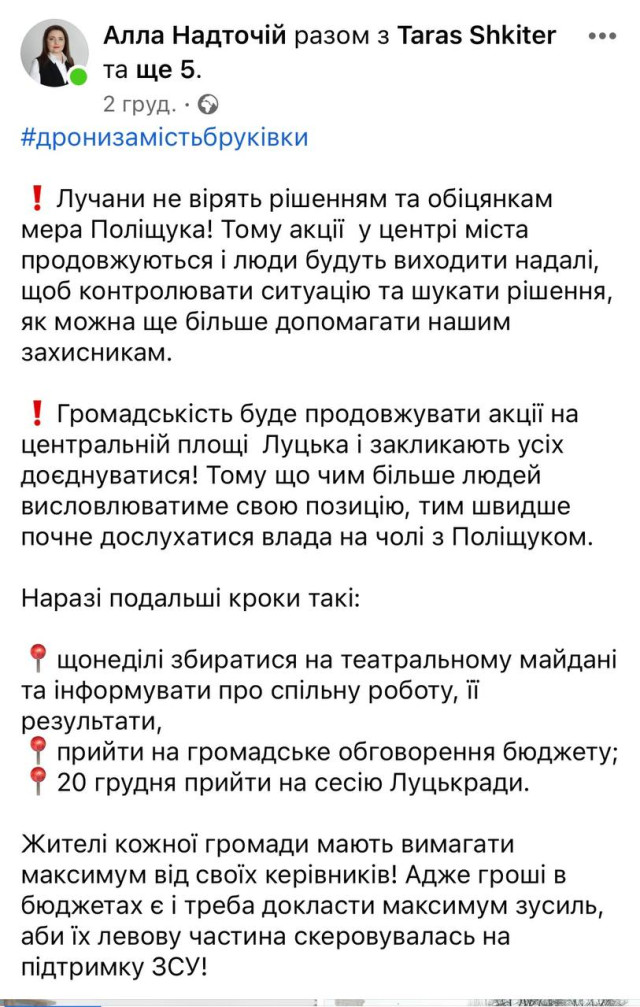 «Свідомі» депутати, своєю чергою, нібито підтримують ініціативу «Дрони замість бруківки». Вони щоразу не втрачають можливості висловити критику на адресу міської ради та Луцького міського голови, мовляв, коштів на Сили оборони виділено надто мало. Однак їх «свідомість» у цьому питанні протягом року була вибірковою: вимагаючи гроші на ЗСУ, депутати водночас неодноразово просили відремонтувати вулиці на їхніх округах, про що свідчать депутатські запити та звернення до Луцького міського голови Ігоря Поліщука.