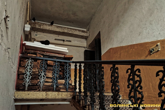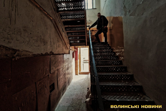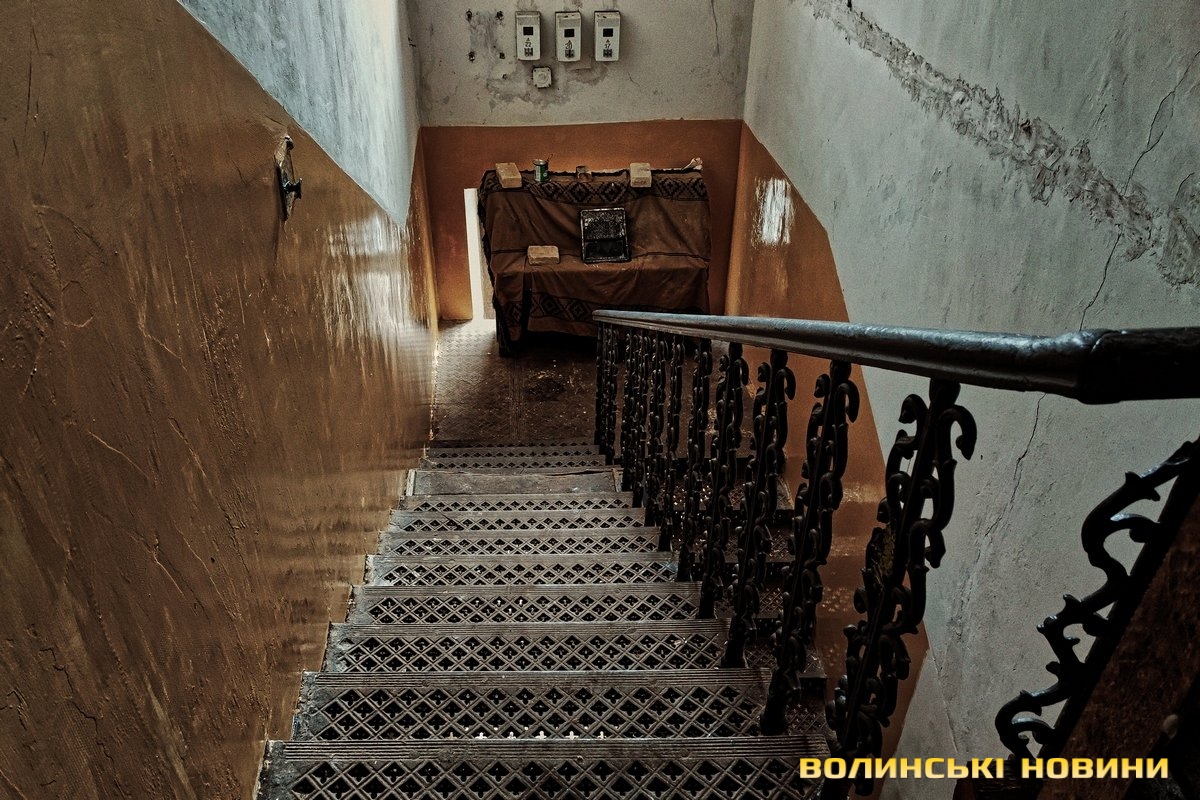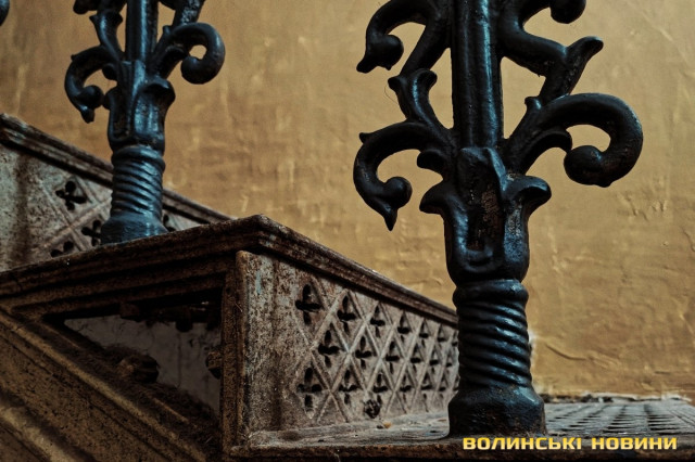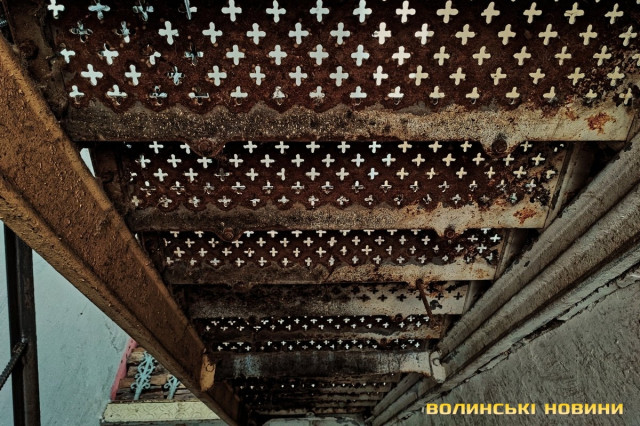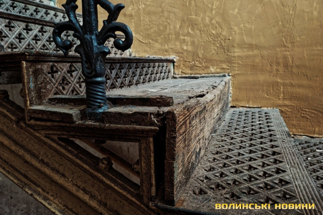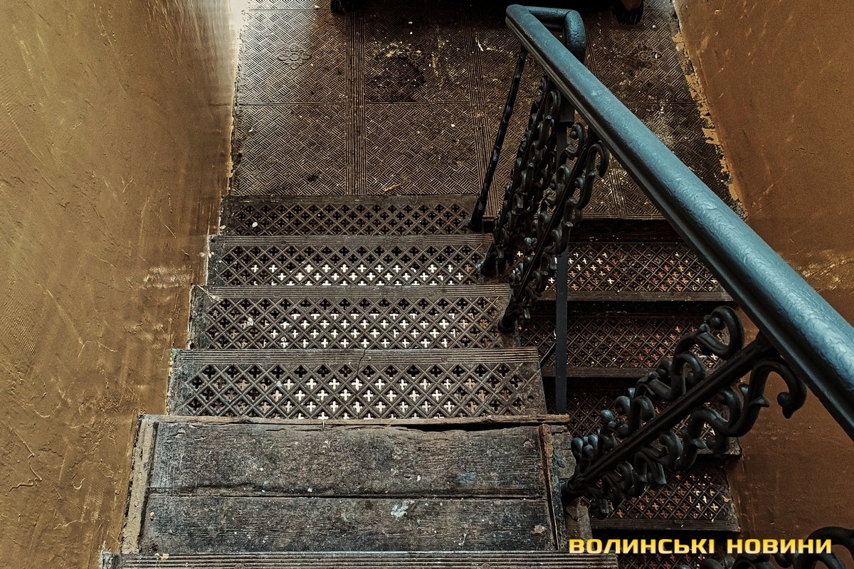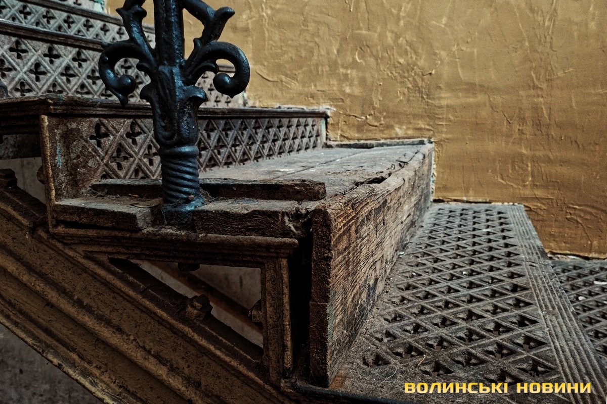 Наверх ведуть старовинні чавунні сходи. Литі стійки із залишками дерев’яних перил, поверх яких наварено невиразну металеву смугу, надають особливого шарму. Деякі з чавунних сходинок надламані, а замість однієї – старі скрипучі дошки.Читати ще: Колонія луцьких чиновників, яка стала вулицею. Фото