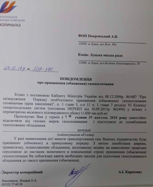 Фірма депутата Луцької міської ради Андрія Покровського найближчим часом може втратити доступ до газопостачання. Регіональна газова компанія "Волиньгаз" надіслала повідомлення про припинення (обмеження) газопостачання на адресу ФОП Покровський А. В., який зарєєстрований за адресою м. Луцьк, пр. Волі 49 а. Лист датований 29 жовтня 2018 року.