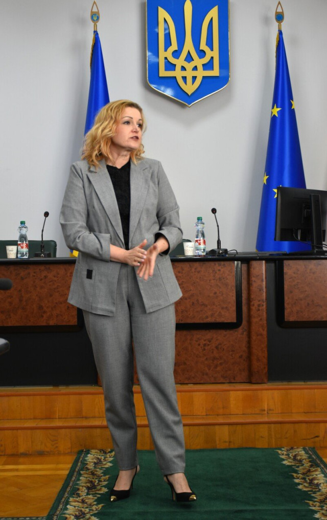 Після вітального слова вона розповіла про географічні, економічні, культурні особливості Луцької громади, можливості її бюджету, організацію роботи різних галузей, підтримку ВПО. Окремо зупинилася на актуальних викликах сьогодення та грантовій і проєктній діяльності.