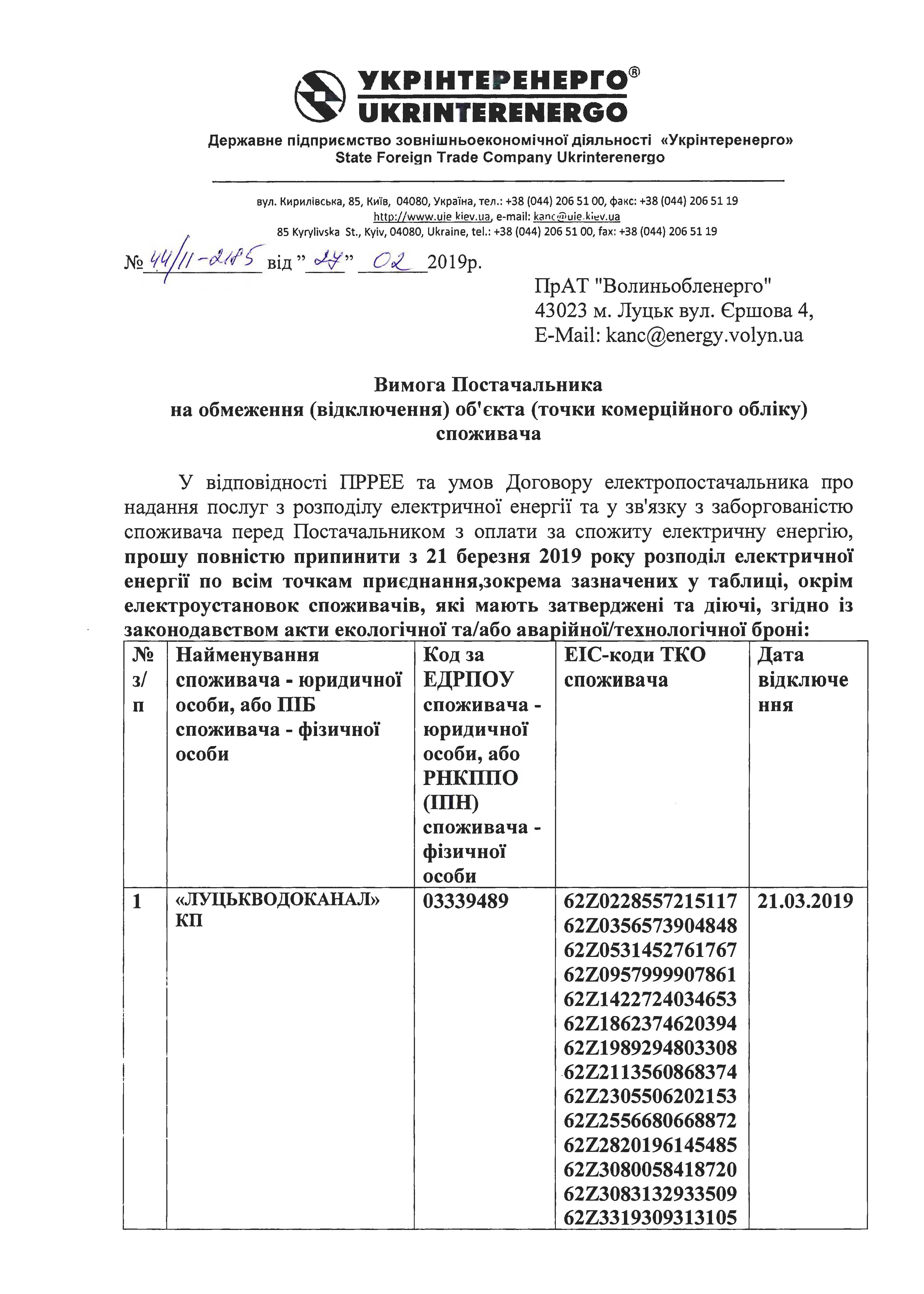 Традиційно «Луцькводоканал» не розрахувався і з ним. У зв’язку з цим постачальник ДПЗД «Укрінтеренерго» 28 лютого висунув вимогу відключення усіх об’єктів КП «Луцькводоканал» з 21 березня о 10:00.