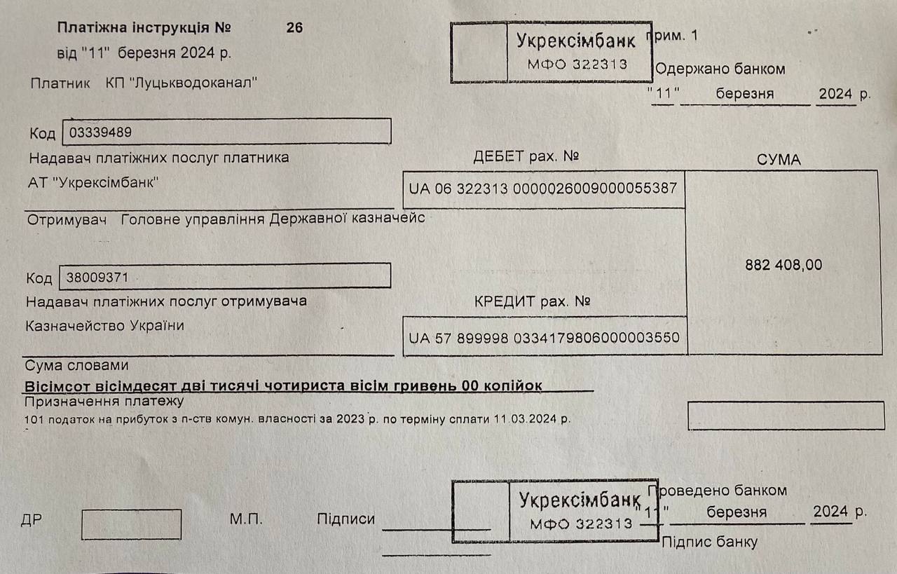 встановило економічно необґрунтований тариф на водопостачання для населення, «Луцькводоканал» нарахував податок на прибуток і перерахував у бюджет Луцької громади майже 900 тисяч гривень.