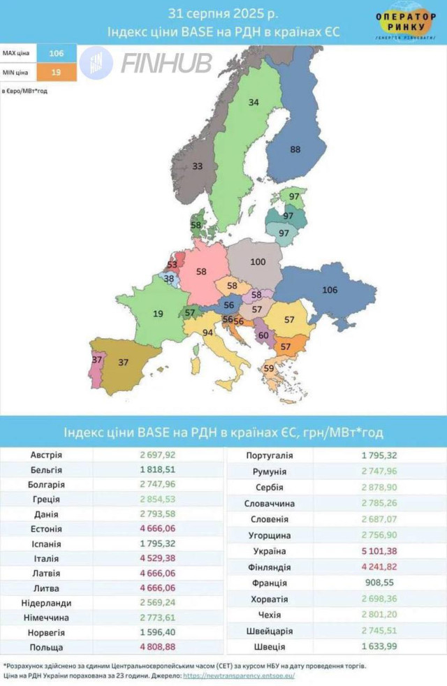 • 31 серпня – 5101 грн/МВт⋅год в Україні проти 909 грн у Франції.