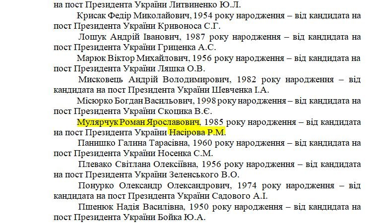 Проте на президентських виборах до місцевої ОВК Мулярчук увійшов не як представник партійного лідера Петра Порошенка, а від іншого кандидата – скандально відомого корупціонера, екс-очільника ДФС України Романа Насірова.