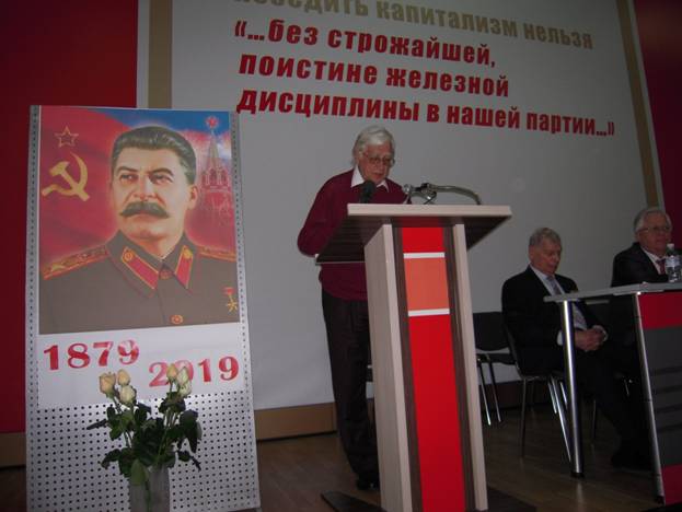 Серед тих, хто виступав, був і чинний член-кореспондент НАН України, доктор історичних наук Солдатенко Валерій Федорович із доповіддю «І. В. Сталін і Україна на переломному історичному етапі», а також голова Київської міської Ради ветеранів, генерал-майор авіації Мартинов Микола Єгорович із виступом «І.В.Сталін – як військовий стратег і організатор Перемоги над фашизмом».