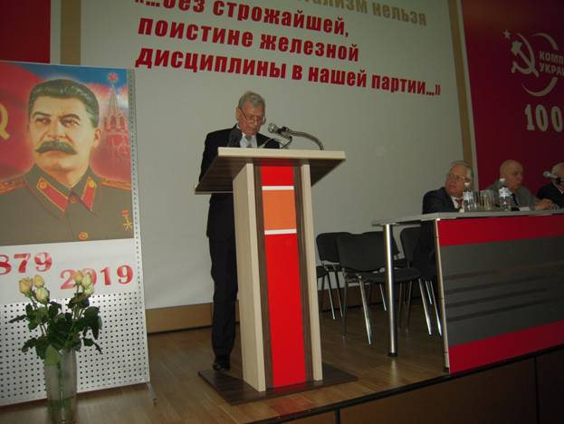 Згідно з повідомленням, «учасники конференції з великим інтересом прослухали доповіді: Симоненка Петра Миколайовича – 1-го секретаря ЦК Компартії України, народного депутата України II-VIII скликань – «Сталінський досвід соціалістичних перетворень радянської країни»; Крючкова Георгія Корнійовича – члена Президії ЦК Компартії України, народного депутата України III-IV скликань – «І.В. Сталін як теоретик марксизму-ленінізму»; Мнацаканова Сергія Олександровича – ректора Партійної школи при ЦК Компартії України – «Внесок І.В. Сталіна в національно-державне будівництво СРСР».
