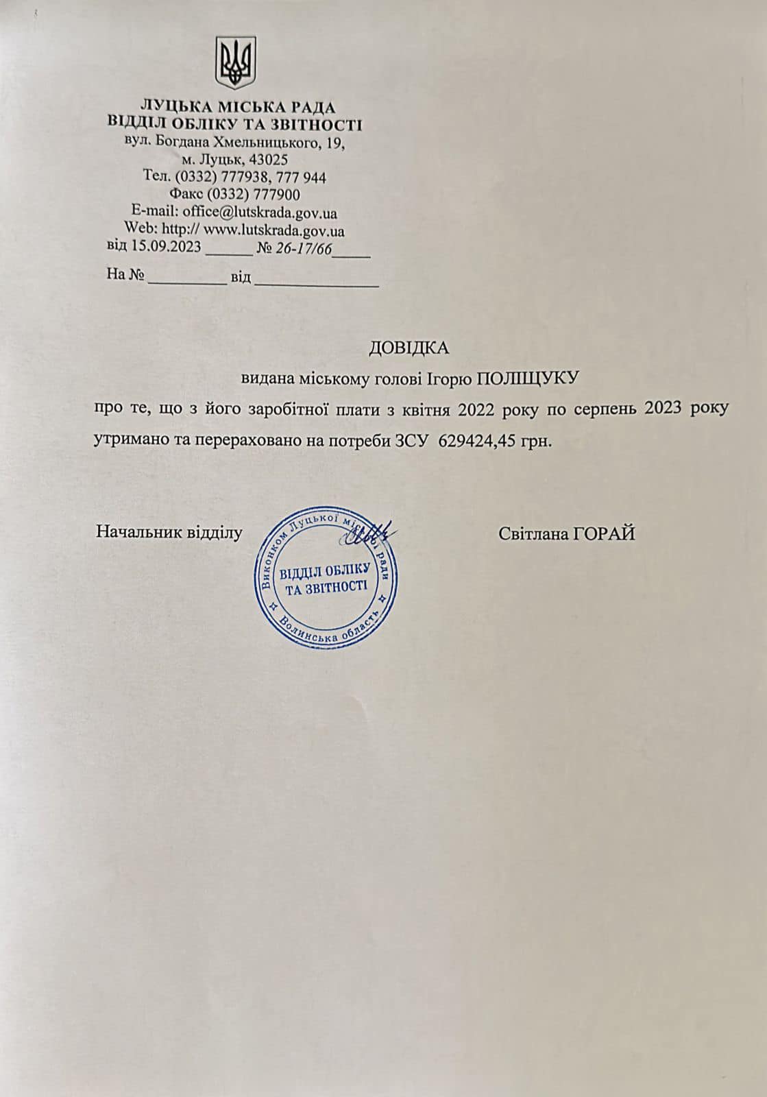 За період із квітня 2022 року до серпня 2023 року із зарплати Луцького міського голови Ігоря Поліщука на потреби ЗСУ було утримано й перераховано 629424,45 грн.
