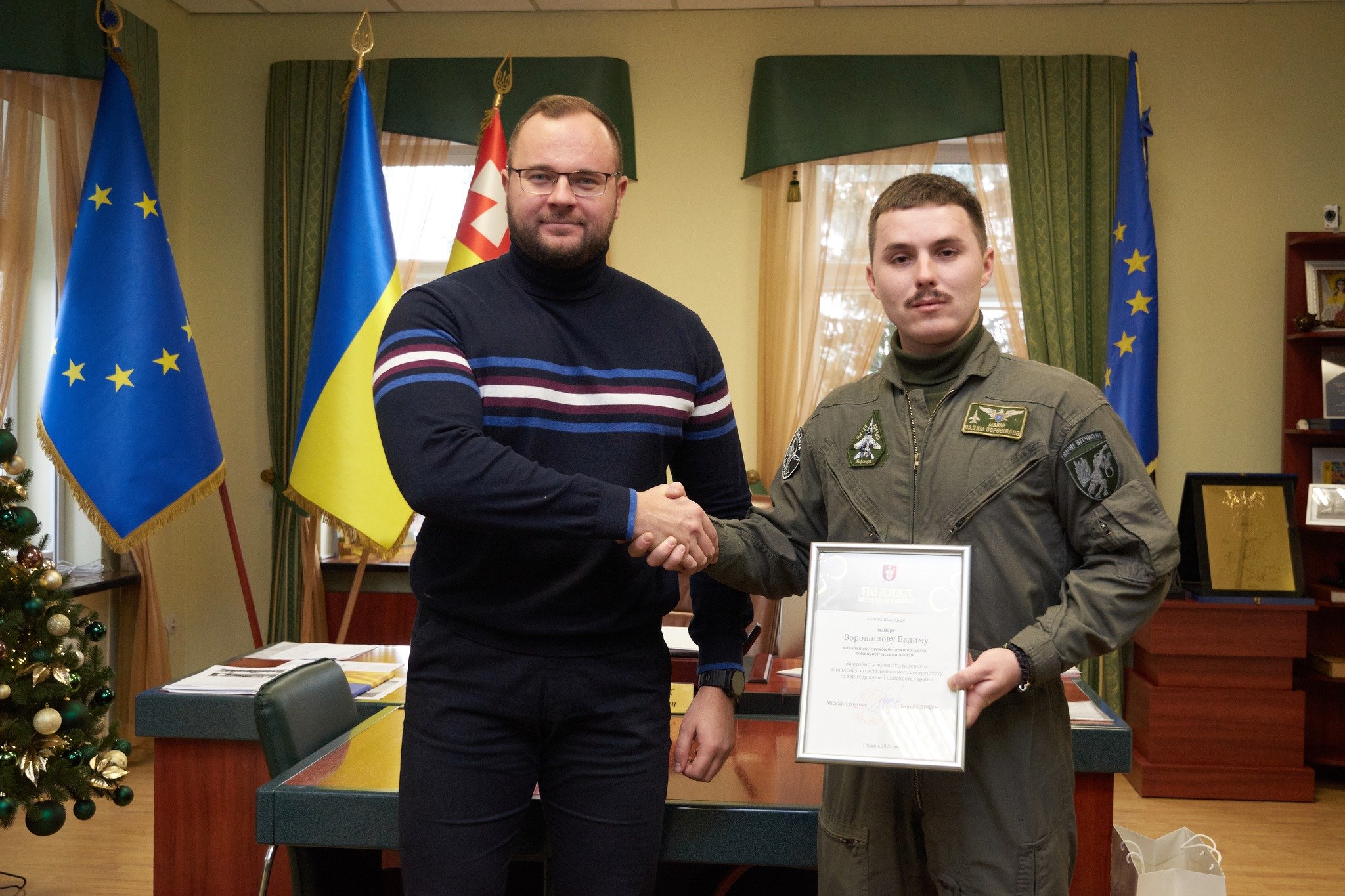Від себе та всіх лучан і українців він подякував льотчику за його героїзм у небі над Вінниччиною 12 жовтня. Тоді Вадим під час бойового завдання знищив п’ять ворожих дронів, а пошкоджений літак вивів за межі населеного пункту.