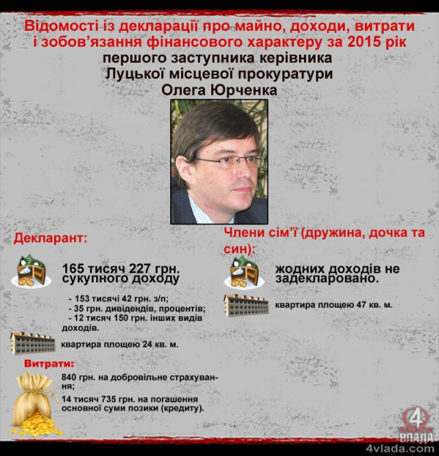 У листопаді 2012 року Олег Юрченко став власником двокімнатної квартири від держави площею 71,5 кв. м. в Луцьку в обмін на однокімнатне помешкання, в якому він проживав до цього.Заступником керівника Луцької місцевої прокуратури стала Катерина Балас.Згідно з біографією, у 2004-2005 роках вона працювала старшим помічником прокурора Ківерцівського району, згодом у 2005-2006 – помічником Волинського природоохоронного міжрайонного прокурора.