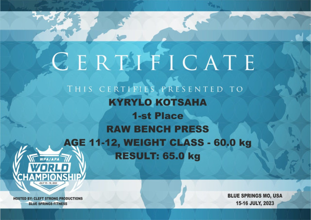 На чемпіонаті Світу з пауерліфтингу в місті Блу-Спрінгс штат Міссурі учень луцького ліцею № 27 Кирило Коцага посів 1 місце в дисципліні «Жим штанги лежачи».