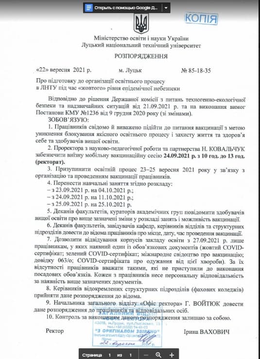 Луцький університет призупинив навчання через невакцинованих викладачів