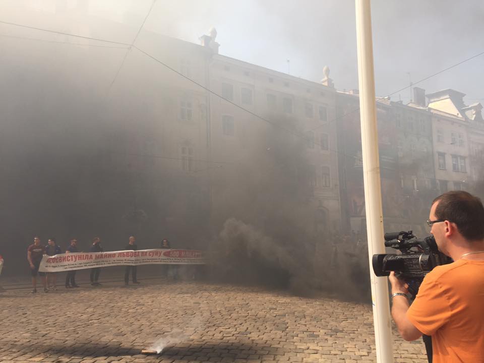Львівську ратушу затягнула чорна димова завіса. Активісти ГО «Розвиток громади» запалили димові шашки, вимагаючи від міського голови Садового вибачень за образи бійців АТО під час так званого сміттєвого віче.