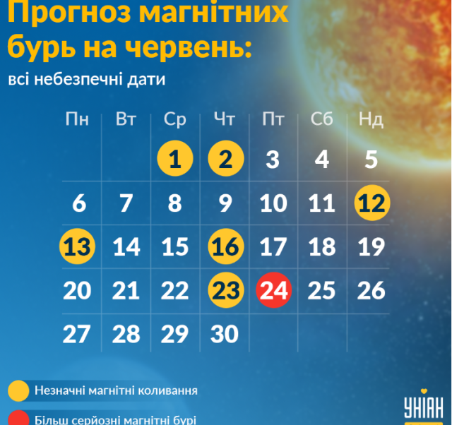 Потужних і тривалих магнітних бур в червні не очікують. Підвищена сонячна активність спостерігатиметься 1-2 червня, 12-13 червня і 16 червня. Дводенну магнітну бурю прогнозують 23 і 24 червня. Активність 24 червня буде досить високою.Найбільше магнітні бурі впливають на метеозалежних і старих людей, тих, хто має хронічні хвороби, вагітних. У небезпечні дні вони можуть відчути такі симптоми: