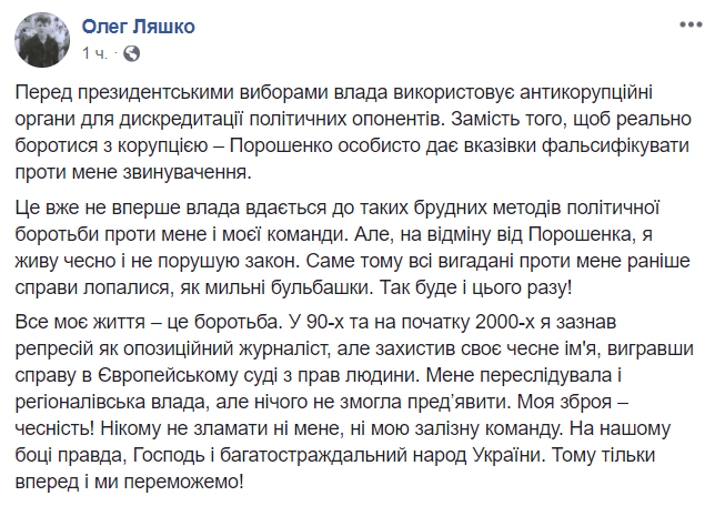 "Перед президентськими виборами влада використовує антикорупційні органи для дискредитації політичних опонентів. Замість того, щоб реально боротися з корупцією - Порошенко особисто дає вказівки фальсифікувати проти мене звинувачення", - написав Ляшко.